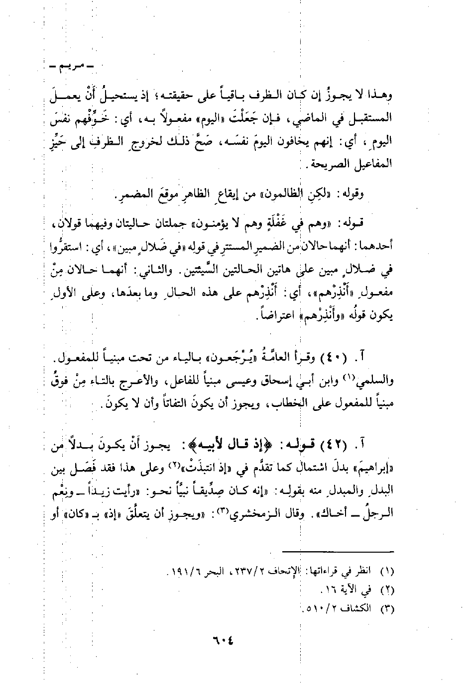 وهذا لا يجوزُ أن كان الظرف باقياً على حقيقته؛ إذ يستحيلُ أَنْ يعملَ المستقبل في الماضي، فإن جَعَلْتَ «اليوم» مفعولاً به، أي: خَوِّفْهم نفسَ اليومِ، أي: إنهم يخافون اليومَ نفسَه، صَحَّ ذلك لخروجِ الظرفِ إلى حَيِّزِ المفاعيل الصريحة.