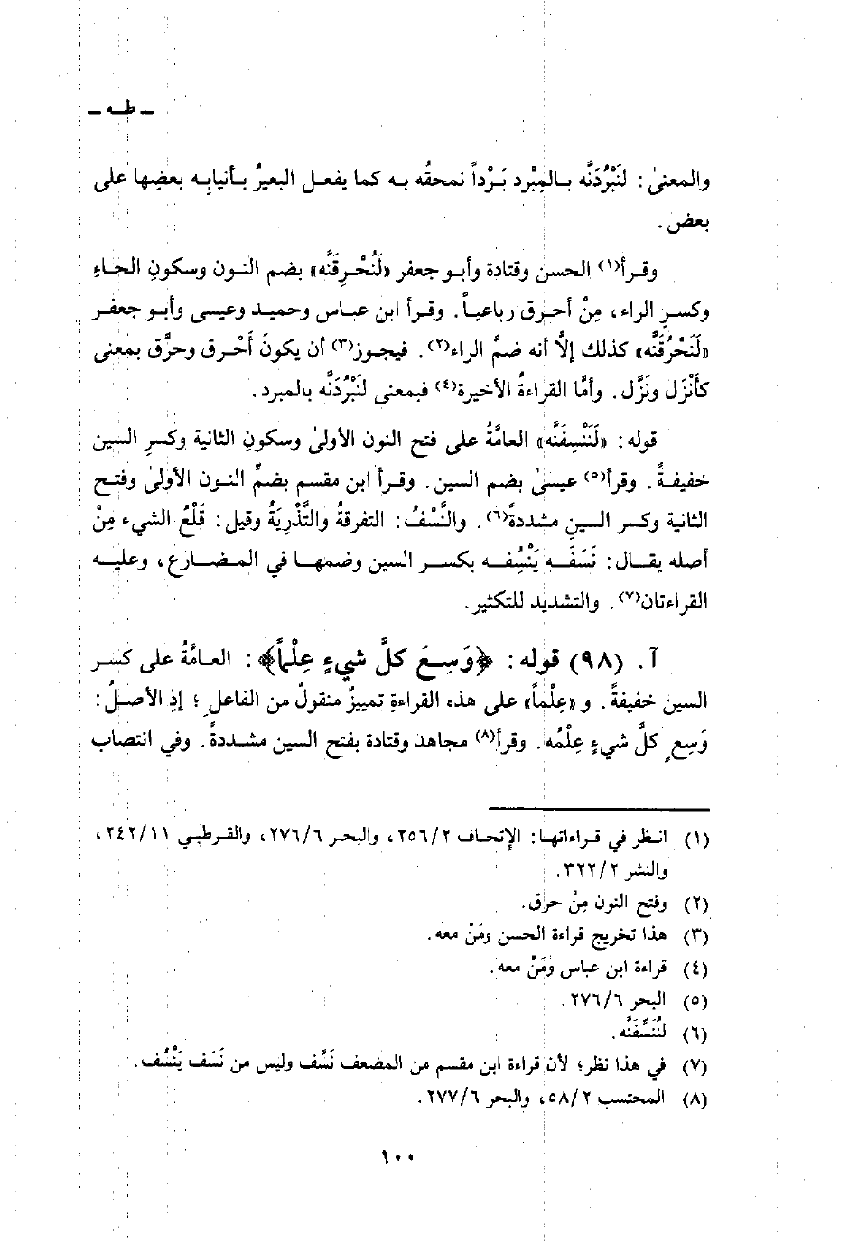 وقرأ الحسن وقتادة وأبو جعفر» لَنُحْرِقَنَّه «بضم النون وسكونِ الحاءِ وكسرِ الراء، مِنْ أحرق رباعياً. وقرأ ابن عباس وحميد وعيسى وأبو جعفر» لَنَحْرُقَنَّه «كذلك إلاَّ أنه ضمَّ الراء. فيجوز أن يكونَ أَحْرق وحرَّق بمعنى كأَنْزَل ونَزَّل. وأمَّا القراءةُ الأخيرة فبمعنى لنَبْرُدَنَّه بالمبرد.