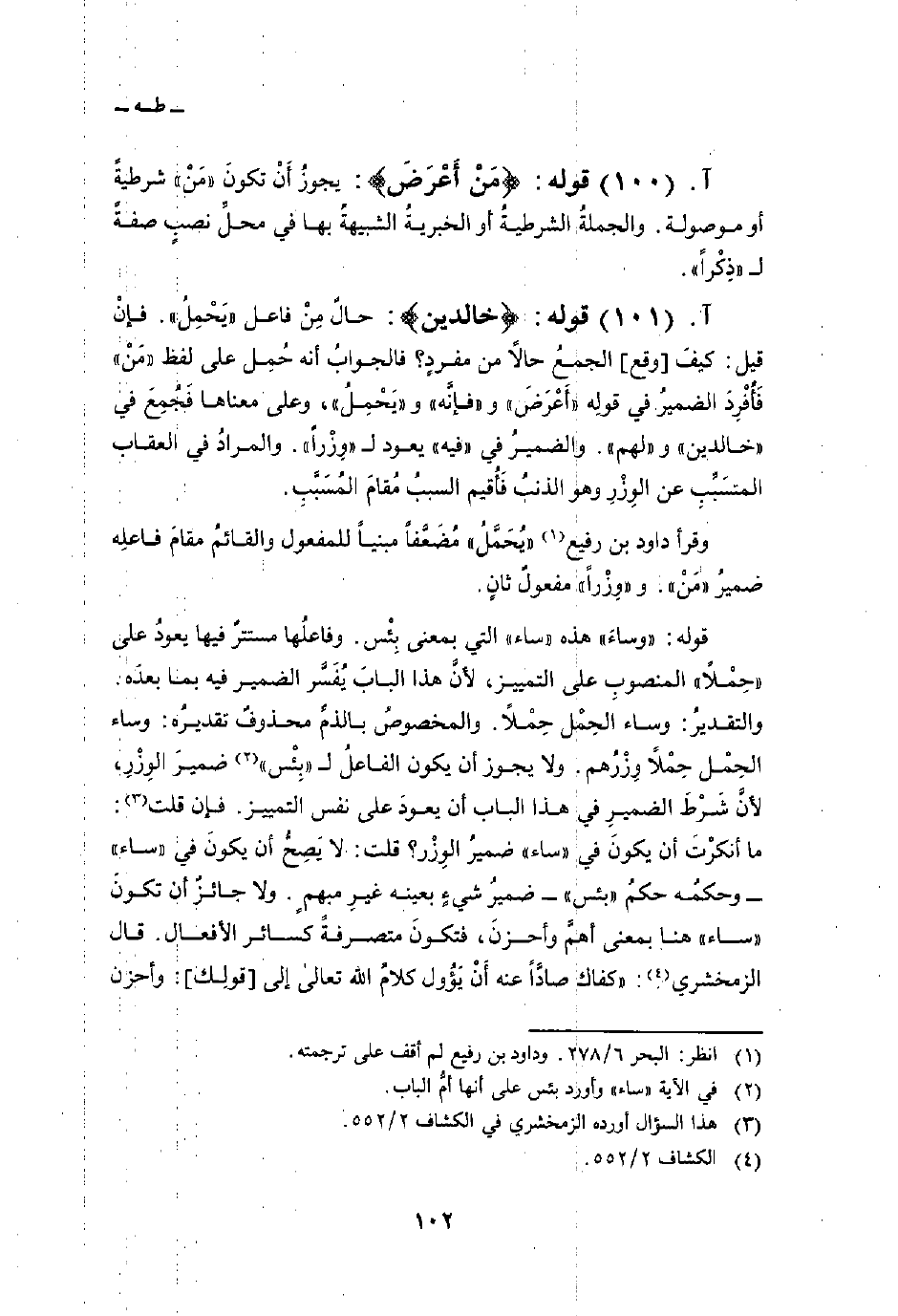 قوله: {خَالِدِينَ} : حالٌ مِنْ فاعل «يَحْمِلُ» . فإنْ قيل: كيفَ [وقع] الجمعُ حالاً من مفردٍ؟ فالجوابُ أنه حُمِل على لفظ «مَنْ» فَأُفْرِدَ الضميرُ في قولِه «أَعْرَضَ» و «فإنَّه» و «يَحْمِلُ» ، وعلى معناها فَجُمِعَ في «خالدين» و «لهم» . والضميرُ في «فيه» يعود ل «وِزْراً» . والمرادُ في العقاب المتسَبِّبِ عن الوِزْرِ وهو الذنبُ فَأُقيم السببُ مُقامَ المُسَبَّبِ.