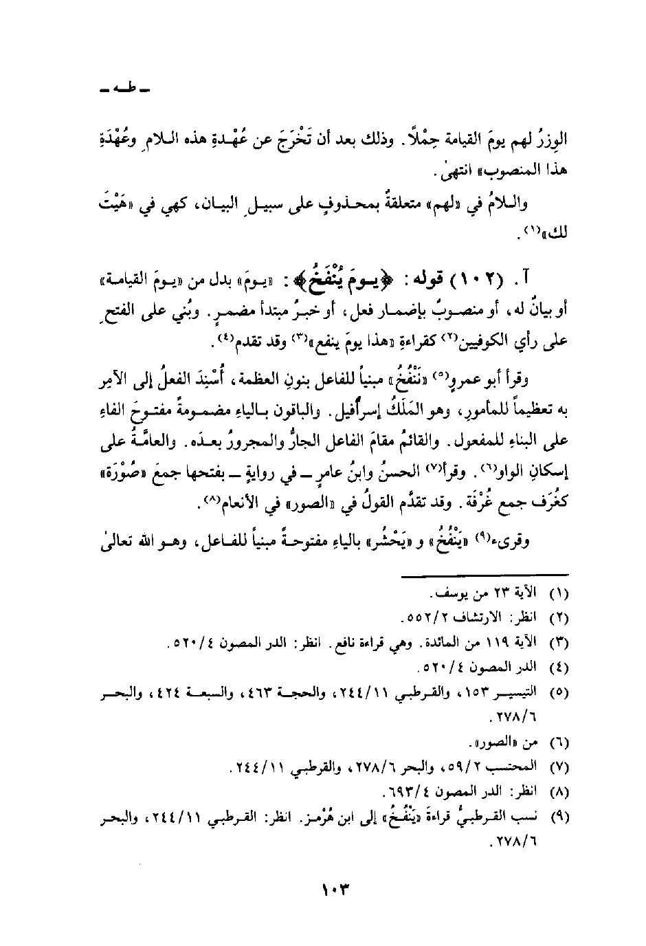 وقرأ أبو عمروٍ «نَنْفُخُ» مبنياً للفاعل بنونِ العظمة، أُسْنِدَ الفعلُ إلى الآمِر به تعظيماً للمأمورِ، وهو المَلَكُ إسرافيل. والباقون بالياءِ مضمومةً مفتوحَ الفاءِ على البناءِ للمفعول. والقائمُ مقامَ الفاعل الجارُّ والمجرورُ بعدَه. والعامَّةُ على إسكانِ الواو. وقرأ الحسنُ وابنُ عامرٍ في روايةٍ بفتحها جمعَ «صُوْرَة» كغُرَف جمع غُرْفَة. وقد تقدَّم القولُ في «الصور» في الأنعام.
