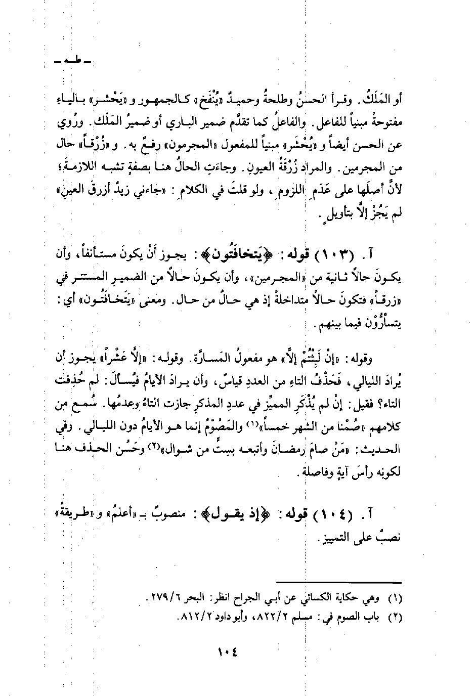 أو المَلَكُ. وقرأ الحسنُ وطلحةُ وحميدٌ «يُنْفَخ» كالجمهور و «يَحْشر» بالياءِ مفتوحةً مبنياً للفاعل. والفاعلُ كما تقدَّم ضمير الباري أو ضميرُ المَلَك. ورُوي عن الحسن أيضاً و «يُحْشَر» مبنياً للمفعول «المجرمون» رفعٌ به. و «زُرْقاً» حال من المجرمين. والمرادُ زُرْقَةُ العيونِ. وجاءَتِ الحالُ هنا بصفةٍ تشبه اللازمةَ؛ لأنَّ أصلَها على عَدَمِ اللزومِ، ولو قلتَ في الكلامِ: «جاءني زيدٌ أزرقَ العينِ» لم يَجُزْ إلاَّ بتأويلٍ.