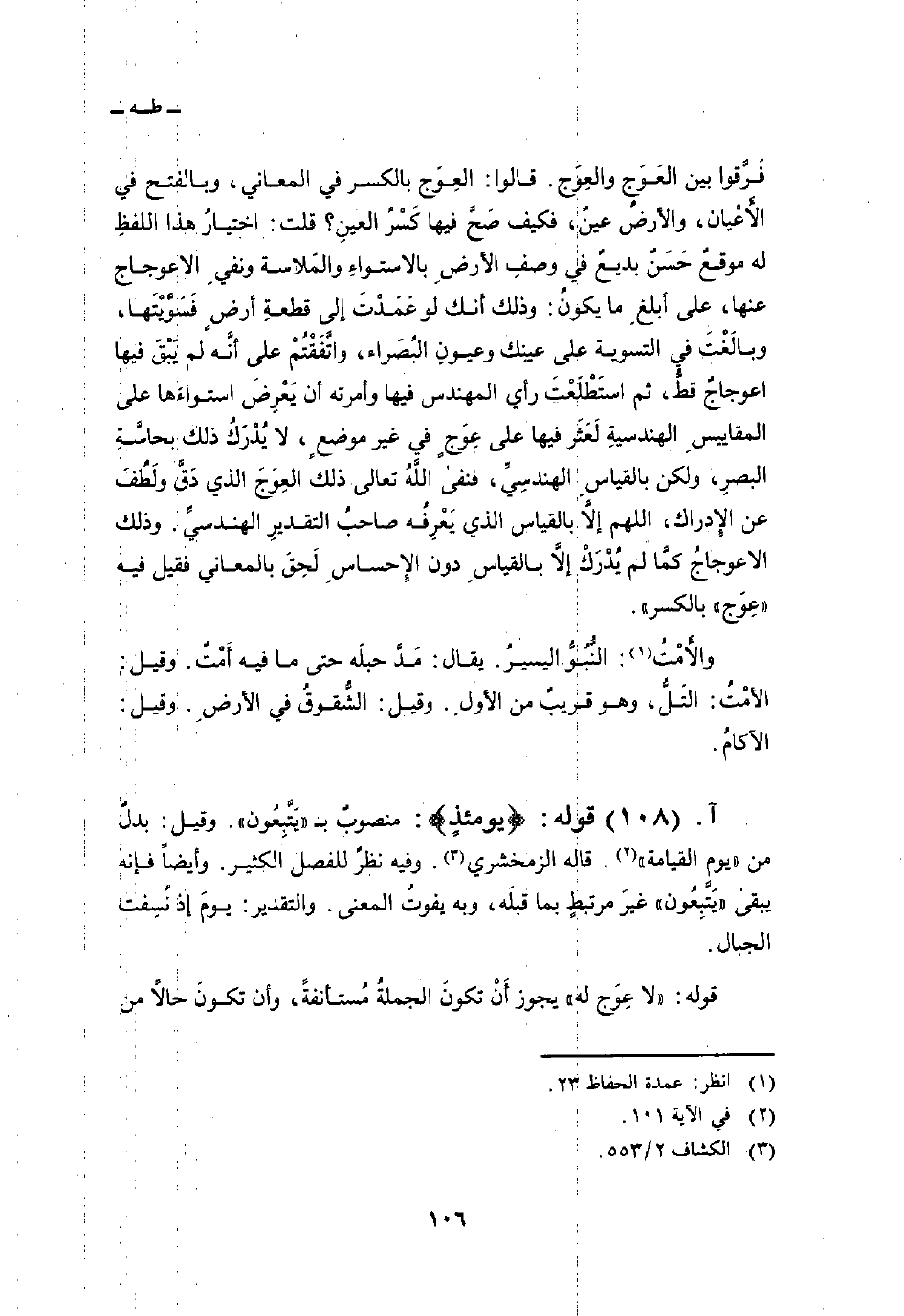 فَرَّقوا بين العَوَج والعِوَج. قالوا: العِوَج بالكسر في المعاني، وبالفتح في الأَعْيان، والأرضُ عينٌ، فكيف صَحَّ فيها كَسْرُ العينِ؟ قلت: اختيارُ هذا اللفظِ له موقعٌ حَسَنٌ بديعٌ في وصفِ الأرضِ بالاستواءِ والمَلاسة ونفيِ الاعوجاج عنها، على أبلغِ ما يكونُ: وذلك أنك لو عَمَدْتَ إلى قطعةِ أرضٍ فَسَوَّيْتَها، وبالَغْتَ في التسوية على عينِك وعيونِ البُصَراء، واتَّفَقْتُمْ على أنَّه لم يَبْقَ فيها اعوجاجٌ قطٌ، وثم استَطْلَعْتَ رأي المهندس فيها وأمرته أن يَعْرِضَ استواءَها على المقاييسِ الهندسيةِ لَعَثَر فيها على عِوَجٍ في غير موضعٍ، لا يُدْرَكُ ذلك بحاسَّةِ البصرِ، ولكن بالقياسِ الهندسِيِّ، فنفى اللهُ تعالى ذلك العِوَجَ الذي دَقَّ ولَطُفَ عن الإِدراك، اللهم إلاَّ بالقياس الذي يَعْرِفُه صاحبُ التقديرِ الهندسيِّ. وذلك الاعوجاجُ كمَّا لم يُدْرَكْ إلاَّ بالقياسِ دون الإِحساسِ لَحِقَ بالمعاني فقيل فيه» عِوج «بالكسر» .