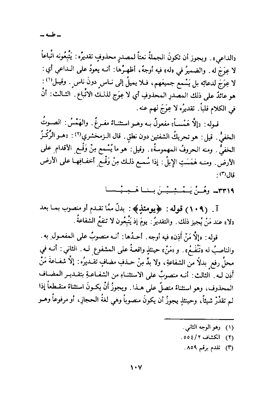 الداعي» . ويجوز أن تكونَ الجملةُ نعتاً لمصدرٍ محذوفٍ تقديرُه: يَتَّبِعُونه اتِّباعاً لا عِوَجَ له. والضميرُ في «له» فيه أوجهٌ، أظهرُها: أنه يعودُ على الداعي أي: لا عِوَجَ لدعائِه بل يَسْمع جميعَهم، فلا يميلُ إلى ناسِ دونَ ناسٍ. وقيل: هو عائدٌ على ذلك المصدرِ المحذوفِ أي لا عِوَج لذلك الاتِّباع. الثالث: أنَّ في الكلام قلباً. تقديرُه لا عِوَجَ لهم عنه.