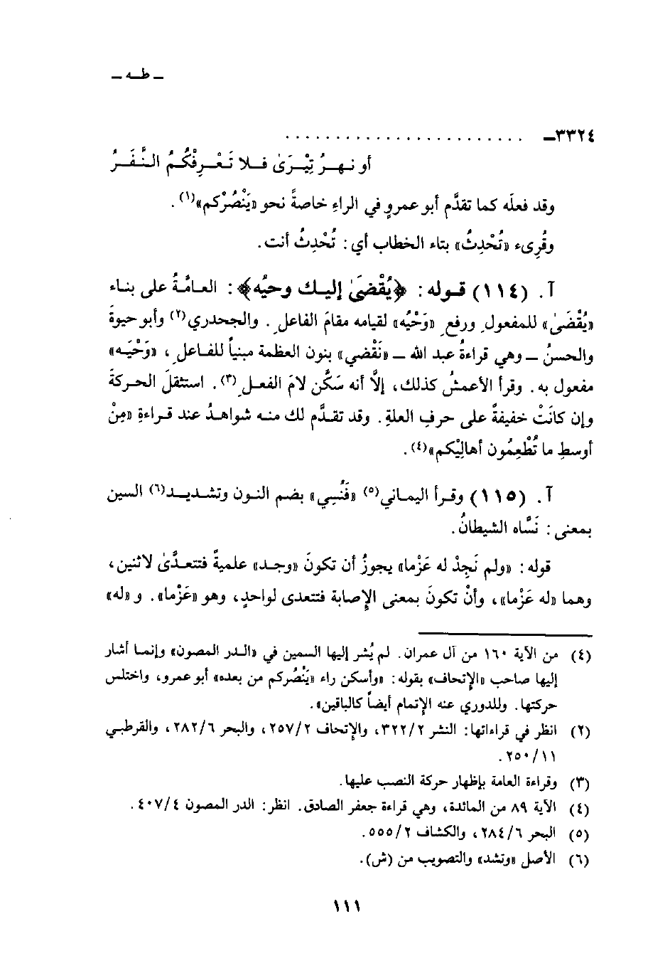قوله: {يقضى إِلَيْكَ وَحْيُهُ} : العامَّةُ على بناء «يقضى» للمفعولِ ورفع «وَحْيُه» لقيامه مقامَ الفاعلِ. والجحدري وأبو حيوةَ والحسنُ وهي قراءةُ عبد الله «نَقْضي» بنون العظمة مبنياً للفاعلِ، «وَحْيَه» مفعول به. وقرأ الأعمشُ كذلك، إلاَّ أنه سَكَّن لامَ الفعلِ. استثقلَ الحركةَ وإن كانَتْ خفيفةً على حرفِ العلةِ. وقد تقدَّم لك منه شواهدُ عند قراءةِ {مِنْ أَوْسَطِ مَا تُطْعِمُونَ أَهْالِيكُمْ} [المائدة: 89] .