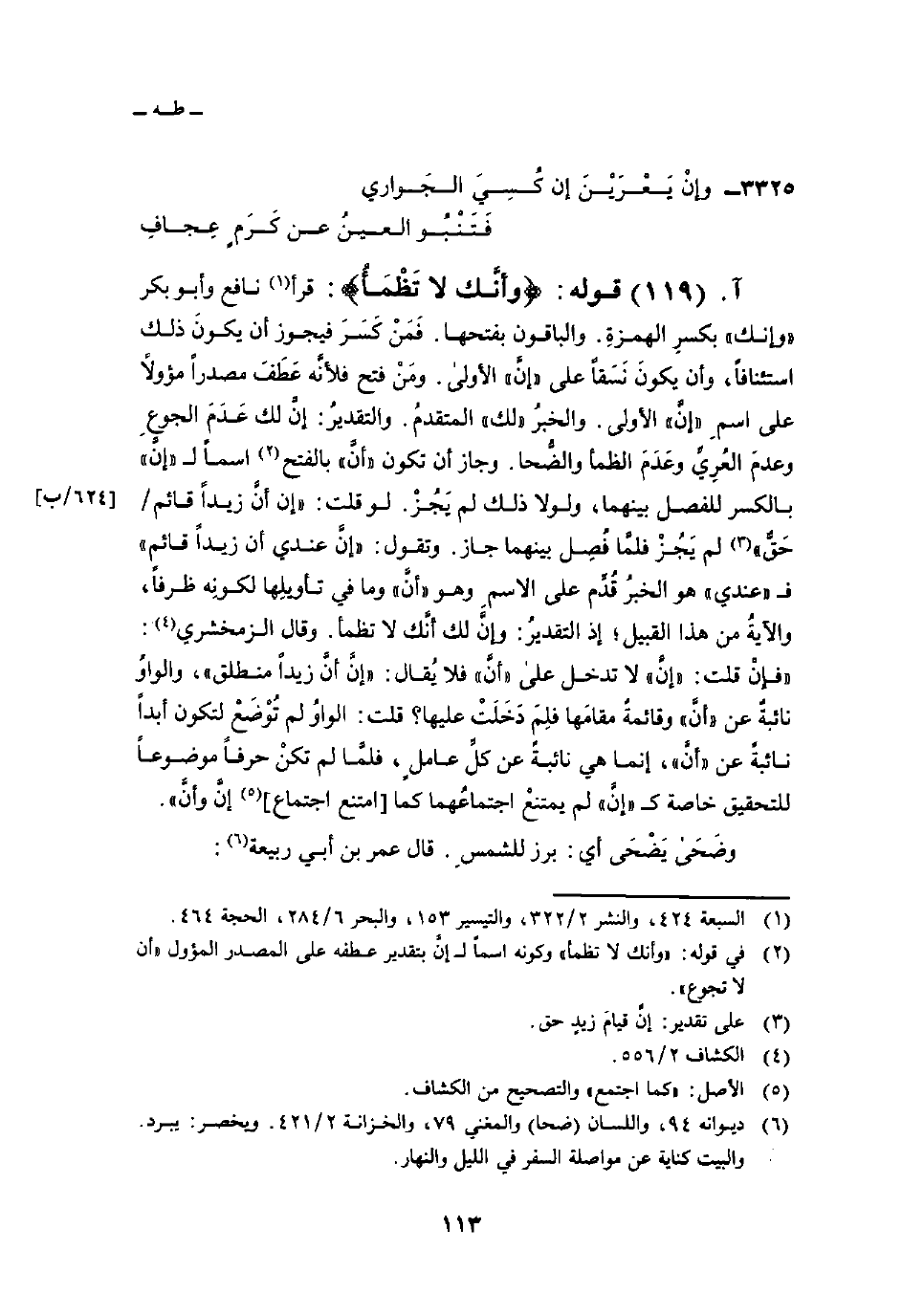 قوله: {وَأَنَّكَ لاَ تَظْمَأُ} : قرأ نافع وأبو بكر و «إنك» بكسرِ الهمزةِ. والباقون بفتحها. فَمَنْ كَسَرَ فيجوز أن يكونَ ذلك استئنافاً، وأن يكونَ نَسَقاً على «إنَّ» الأولى. ومَنْ فتح فلأنَّه عَطَفَ مصدراً مؤولاً على اسمِ «إنَّ» الأولى. والخبرُ «لك» المتقدمُ. والتقديرُ: إنَّ لك عَدَمَ الجوعِ وعدمَ العُرِيِّ وعَدَمَ الظمأ والضُّحا. وجاز أن تكون «أنَّ» بالفتح أسماً ل «إنَّ» بالكسر للفصل بينهما، ولولا ذلك لم يَجُزْ. لو قلت: «إن إنَّ زيداً قائم/ حَقٌّ» لم يَجُزْ فلمَّا فُصِل بينهما جاز. وتقول: «إنَّ عندي أن زيداً قائم» ف «عندي» هو الخبرُ قُدِّم على الاسمِ وهو «أنَّ» وما في تأويلِها لكونِه ظرفاً، والآيةُ من هذا القبيل؛ إذ التقديرُ: وإنَّ لك أنَّك لا تظمأ. وقال الزمخشري: «فإنْ قلت:» إنَّ «لا تدخل على» أنَّ «فلا يُقال:» إنَّ أنَّ زيداً منطلق «، والواوُ نائبةٌ عن» أنَّ «، وقائمةٌ مقامَها فِلمَ دَخَلَتْ عليها؟ قلت: الواوُ لم تُوْضَعْ لتكون أبداً نائبةً عن» أنَّ «إنما هي نائبةٌ عن كلِّ عاملٍ، فلمَّا لم تكنْ حرفاً موضوعاً للتحقيق خاصة ك» إنَّ «لم يمتنعْ اجتماعُهما كما [امتنع اجتماع] إنَّ وأنَّ» .