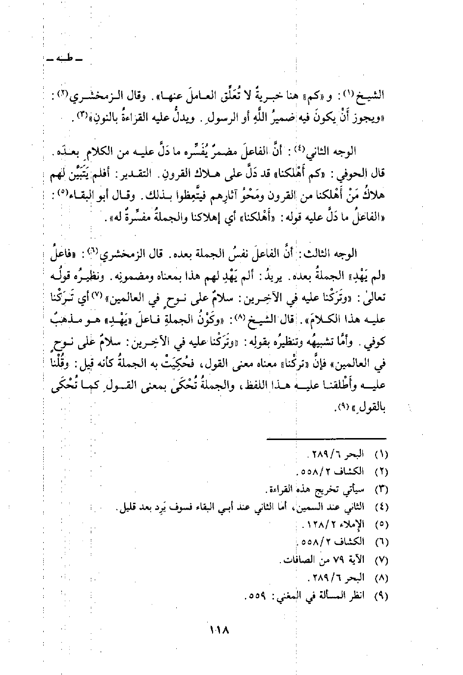 الوجه الثالث: أنَّ الفاعلَ نفسُ الجملة بعده. قال الزمخشري:» فاعلُ «لم يَهْدِ» الجملةُ بعده. يريدُ: ألم يَهْدِ لهم هذا بمعناه ومضمونِه. ونظيرُه قولُه تعالى: {وَتَرَكْنَا عَلَيْهِ فِي الآخرين سَلاَمٌ على نُوحٍ فِي العالمين} [الصافات: 79] أي تَرَكْنا عليه هذا الكلامَ «. قال الشيخ:» وكَوْنَ الجملةِ فاعلَ «يَهْدِ» هو مذهبٌ كوفي. وأمَّا تشبيهُه وتنظيرُه بقولِه: {وَتَرَكْنَا عَلَيْهِ فِي الآخرين سَلاَمٌ على نُوحٍ فِي العالمين} فإنَّ «تركْنا» معناه معنى القول، فحُكِيَتْ به الجملةُ كأنه قيل: وقُلْنا عليه وأَطْلقنا عليه هذا اللفظ، والجملةُ تحكى بمعنى القولِ كما تُحْكَى بالقولِ «.