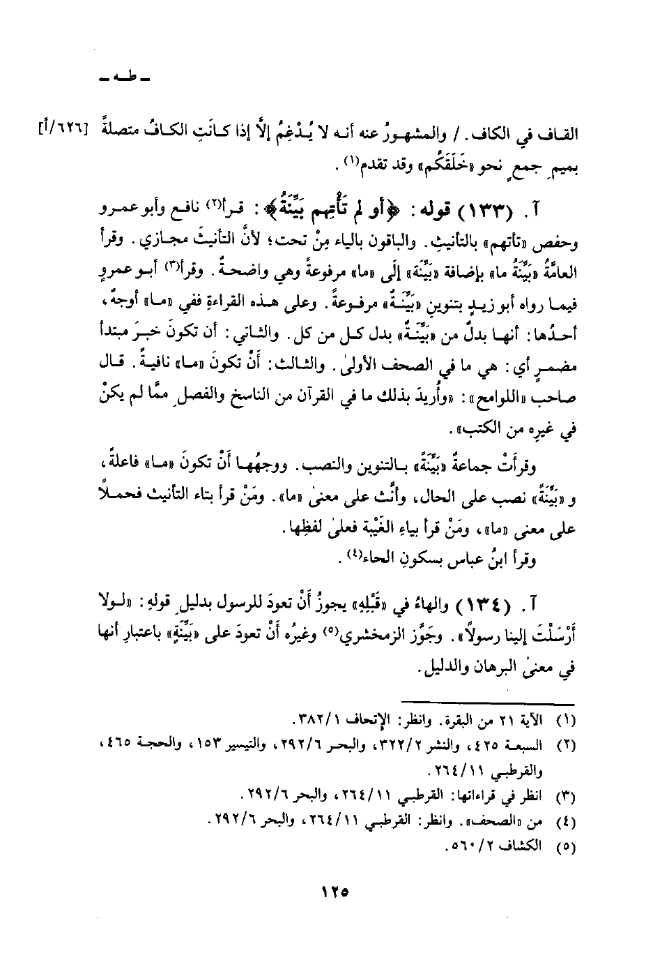 قوله: {أَوَلَمْ تَأْتِهِمْ بَيِّنَةُ} : قرأ نافع وأبو عمرو وحفص «تأتهم» بالتأنيثِ والباقون بالياء مِنْ تحت؛ لأنَّ التأنيثَ مجازي. وقرأ العامَّةُ «بَيِّنَةُ ما» بإضافة «بَيِّنَة» إلَى «ما» مرفوعةً وهي واضحةٌ. وقرأ أبو عمروٍ فيما رواه أبو زيدٍ بتنوينِ «بَيِّنَةٌ» مرفوعةً. وعلى هذه القراءةِ ففي «ما» أوجهٌ، أحدُها: أنها بدلٌ من «بَيِّنَةٌ» بدل كل من كل. والثاني: أن تكونَ خبرَ مبتدأ مضمرٍ أي: هي ما في الصحف الأولى. والثالث أَنْ تكونَ «ما» نافيةً. قال صاحب: اللوامح «:» وأُريدَ بذلك ما في القرآن من الناسخ والفصلِ ممَّا لم يكنْ في غيرِه من الكتب «.