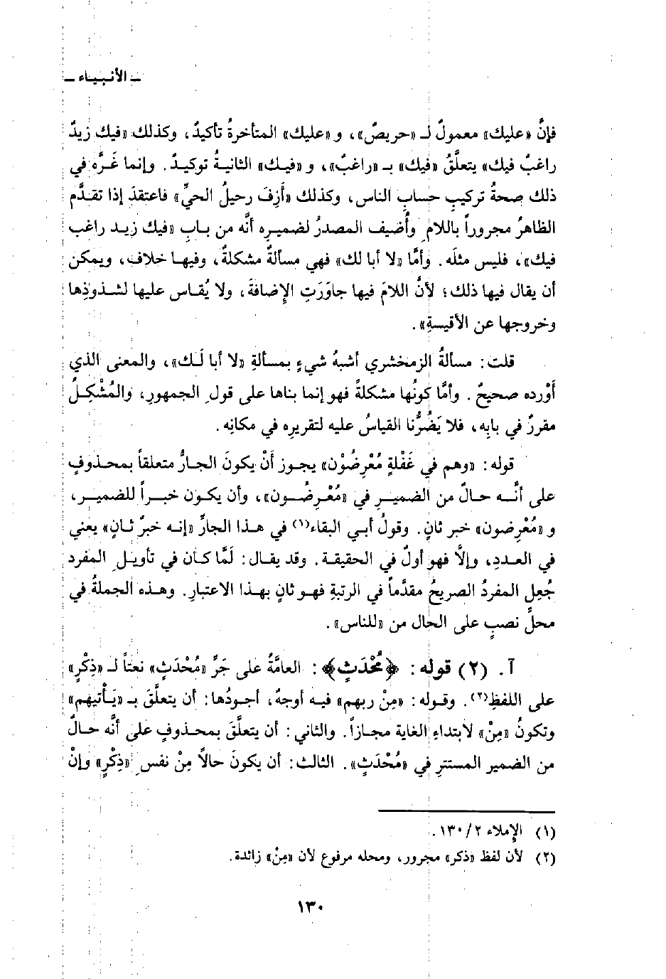 قوله: {وَهُمْ فِي غَفْلَةٍ مُّعْرِضُونَ} يجوز أَنْ يكونَ الجارُّ متعلقاً بمحذوفٍ على أنَّه حالٌ من الضميرِ في» مُعْرِضُون «، وأن يكون خبراً للضمير، و» مُعْرِضون «خبر ثانٍ. وقولُ أبي البقاء في هذا الجارِّ» إنه خبرٌ ثانٍ «يعني في العددِ، وإلاَّ فهو أولٌ في الحقيقة. وقد يقال: لَمَّا كان في تأويلِ المفرد جُعِل المفردُ الصريحُ مقدَّماً في الرتبةِ فهو ثانٍ بهذا الاعتبارِ. وهذه الجملةُ في محلِّ نصبٍ على الحال من» للناس «.