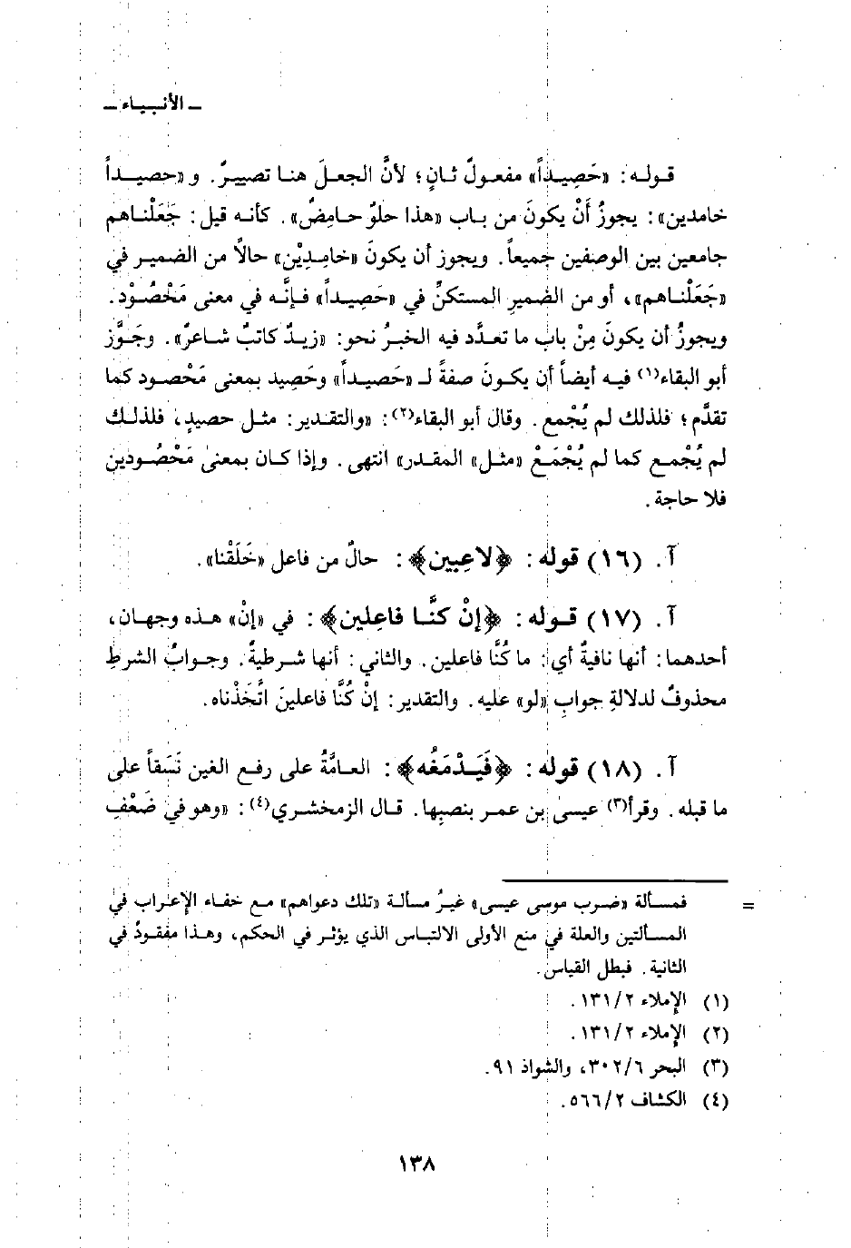 قوله: {حَصِيداً} مفعولٌ ثانٍ؛ لأنَّ الجعلَ هنا تصييرٌ. و {حَصِيداً خَامِدِينَ} : يجوزُ أَنْ يكونَ من باب «هذا حلوٌ حامِضٌ» . كأن قيل: جَعَلْناهم جامعين بين الوصفين جميعاً. ويجوز أن يكونَ «خامِدِيْن» حالاً من الضمير في «جَعَلْناهم» ، أو من الضميرِ المستكنِّ في «حَصِيداً» فإنَّه في معنى مَحْصُود. ويجوزُ أن يكونَ مِنْ باب ما تعدَّد فيه الخبرُ نحو: «زيدٌ كاتبٌ شاعرٌ» . وجَوَّز أبو البقاء فيه أيضاً أن يكونَ صفةً ل «حَصيداً» وحَصِيد بمعنى مَحْصود كما تقدَّم؛ فلذلك لم يُجْمع. وقال أبو البقاء: «والتقدير: مثل حصيدٍ، فلذلك لم يُجْمع كما لم يُجْمَعْ» مثل «المقدر» انتهى. وإذا كان بمعنى مَحْصُودين فلا حاجة.