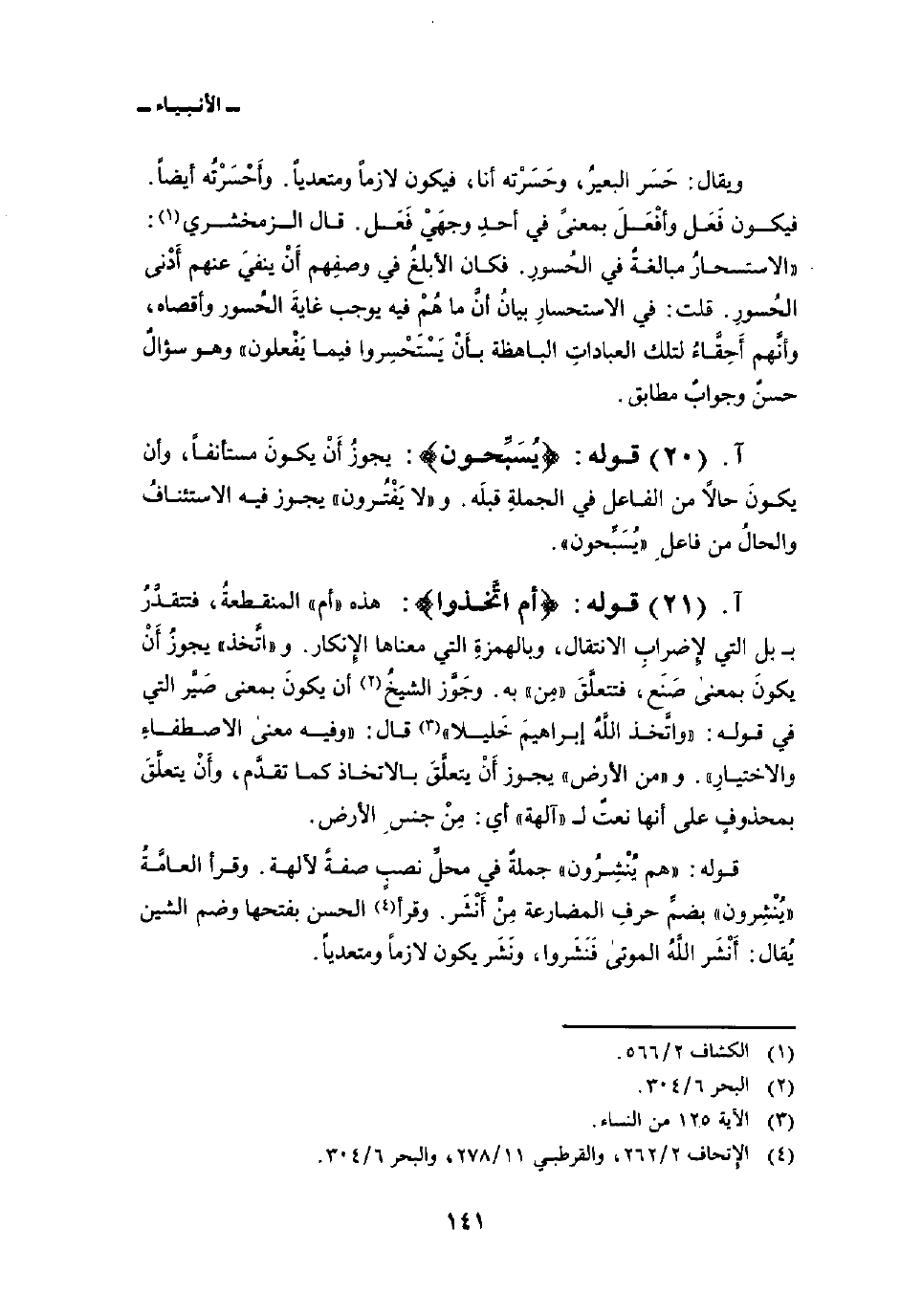 ويقال: حَسَر البعيرُ، وحَسَرْته أنا، فيكون لازماً ومتعدياً. وأَحْسَرْتُه أيضاً. فيكون فَعَل وأفْعَلَ بمعنىً في أحدِ وجهَيْ فَعَل. قال الزمخشري: «الاستحسارُ مبالغةٌ في الحُسورِ. فكان الأبلغُ في وصفِهم أَنْ ينفيَ عنهم أَدْنى الحُسورِ. قلت: في الاستحسارِ بيانُ أنَّ ما هُمْ فيه يوجب غايةَ الحُسور وأقصاه، وأنَّهم أَحِقَّاءُ لتلك العباداتِ الباهظة بأَنْ يَسْتَحْسِروا فيما يَفْعلون» وهو سؤالٌ حسنٌ وجوابٌ مطابق.