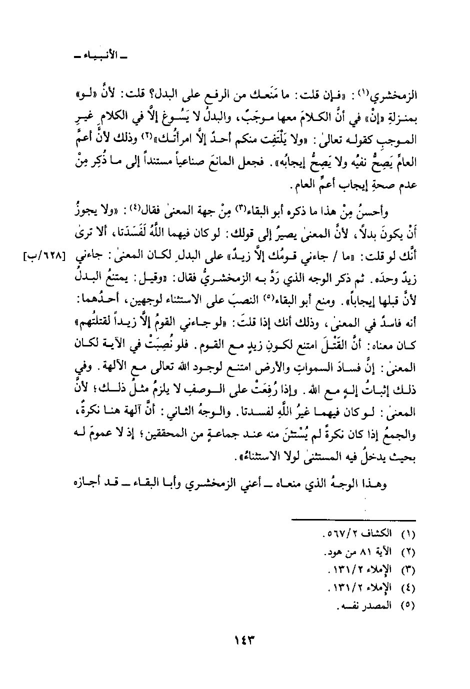 الزمخشري: «فإن قلت: ما مَنَعك من الرفع على البدل؟ قلت: لأنَّ» لو «بمنزلةِ» إنْ «في أنَّ الكلامَ معها موجَبٌ، والبدلُ لا يَِسُوغ إلاَّ في الكلام غيرِ الموجبِ كقوله تعالى: {وَلاَ يَلْتَفِتْ مِنكُمْ أَحَدٌ إِلاَّ امرأتك} [هود: 81] وذلك لأنَّ أعمَّ العامِّ يَصِحُّ نفيُه ولا يَصِحُّ إيجابُه» . فجعل المانعَ صناعياً مستنداً إلى ما ذُكِر مِنْ عدم صحةِ إيجاب أعمِّ العام.