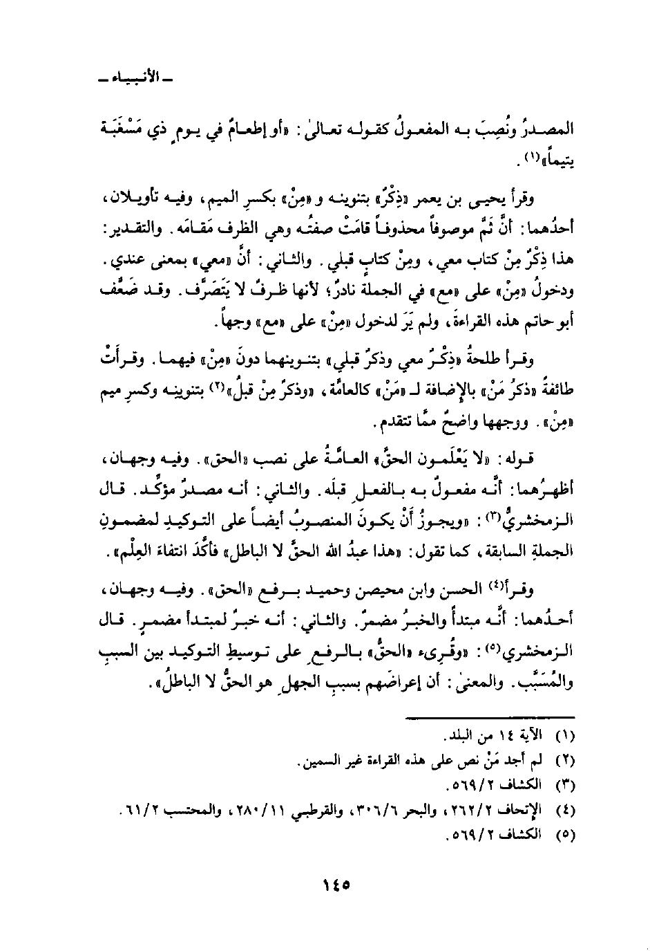وقرأ الحسن وابن محيصن وحميد برفع «الحق» . وفيه وجهان، أحدُهما: أنَّه مبتدأٌ والخبرُ مضمرٌ. والثاني: أنه خبرٌ لمبتدأ مضمرٍ. قال الزمخشري: «وقُرِىء» الحقُّ «بالرفعِ على توسيطِ التوكيد بين السببِ والمُسَبَّب. والمعنى: أن إعراضَهم بسببِ الجهلِ هو الحقُّ لا الباطلُ» .
