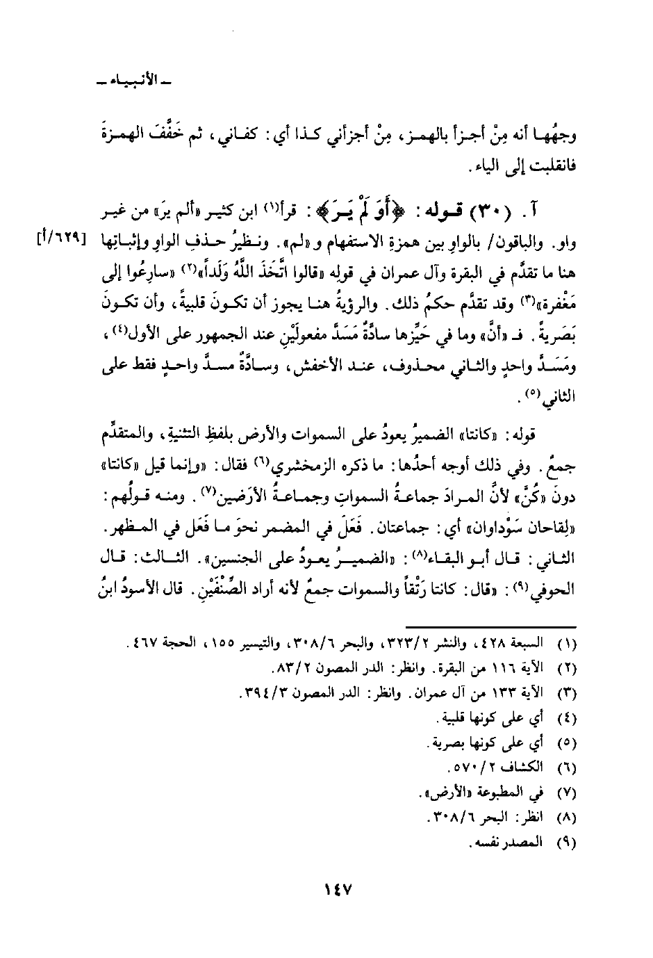 قوله: {كَانَتَا} الضميرُ يعودُ على السماوات والأرض بلفظِ التثنيةِ، والمتقدِّم جمعٌ. وفي ذلك أوجه أحدُها: ما ذكره الزمخشري فقال: «وإنما قيل» كانتا «دونَ» كُنَّ «لأنَّ المرادَ جماعةُ السماواتِ وجماعةُ الأرَضين. ومنه قولُهم:» لِقاحان سَوْداوان «أي: جماعتان. فَعَلَ في المضمر نحوَ ما فَعَل في المظهر. الثاني: قال أبو البقاء:» الضميرُ يعودُ على الجنسين «. الثالث: قال الحوفي:» قال: كانتا رَتْقاً والسماوات جمعٌ لأنه أراد الصِّنْفَيْنِ. قال الأسودُ ابنُ
