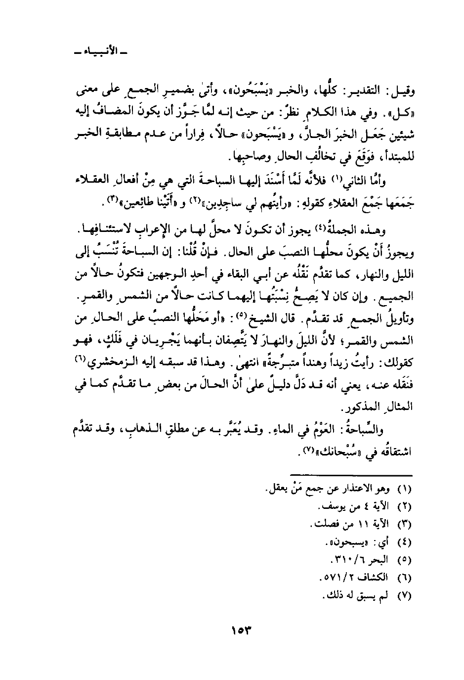 وهذه الجملةُ يجوز أن تكونَ لا محلَّ لها من الإِعرابِ لاستئنافِها. ويجوزُ أَنْ يكونَ محلُّها النصبَ على الحال. فإنْ قُلْنا: إن السباحةَ تُنْسَبُ إلى الليل والنهار، كما تقدَّم نَقْلُه عن أبي البقاء في أحدِ الوجهين فتكونُ حالاً من الجميع. وإن كان لا يَصِحُّ نِسْبَتُها إليهما كانت حالاً من الشمسِ والقمرِ. وتأويلُ الجمعِ قد تقدَّم. قال الشيخ: «أو مَحَلُّها النصبُ على الحالِ من الشمس والقمر؛ لأنَّ الليلَ والنهارَ لا يَتَّصِفان بأنهما يَجْرِيان في فَلَكٍ، فهو كقولك: رأيتُ زيداً وهنداً متبرِّجةً» انتهى. وهذا قد سبقه إليه الزمخشري فَنَقَله عنه، يعني أنه قد دَلَّ دليلٌ على أنَّ الحالَ من بعضِ ما تقدَّم كما في المثالِ المذكور.