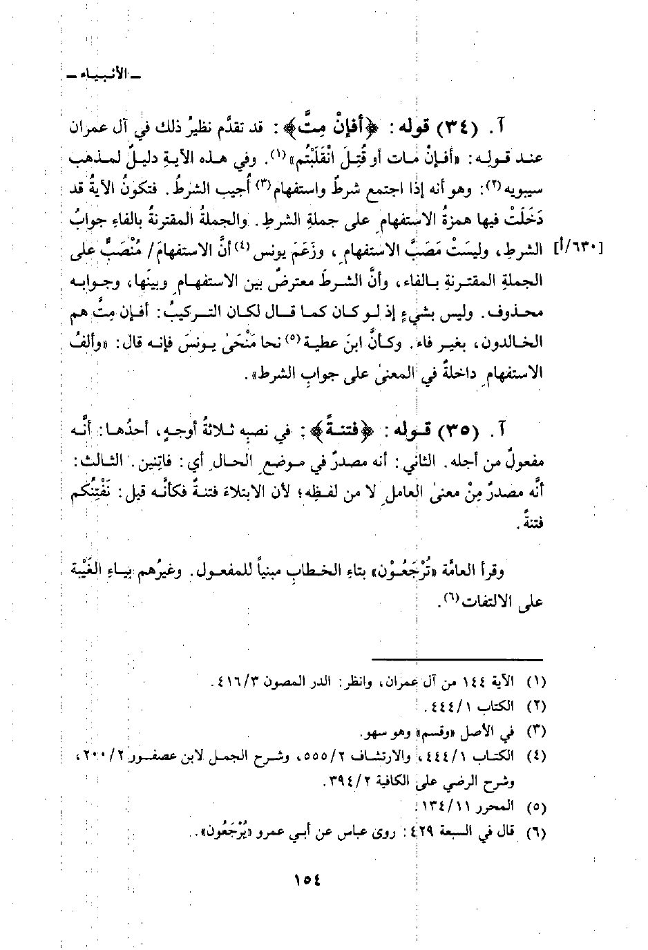 قوله: {أَفَإِيْن مِّتَّ} : قد تقدَّم نظيرُ ذلك في آل عمران عند قولِه: {أَفَإِيْن مَّاتَ أَوْ قُتِلَ انقلبتم} [الآية: 144] . وفي هذه الآيةِ دليلٌ لمذهب سيبويه: وهو أنه إذا اجتمع شرطٌ واستفهام أُجيب الشرطُ. فتكونُ الآيةُ قد دَخَلَتْ فيها همزةُ الاستفهامِ على جملةِ الشرطِ. والجملةُ المقترنةُ بالفاءِ جوابُ الشرطِ، وليسَتْ مَصَبَّ الاستفهامِ، وزَعَمَ يونس أنَّ الاستفهامَ/ مُنْصَبٌّ على الجملةِ المقترنةِ بالفاء، وأنَّ الشرطَ معترضٌَ بين الاستفهامِ وبينَها، وجوابه محذوف. وليس بشيءٍ إذ لو كان كما قال لكان التركيبُ: أفإن مِتَّ هم الخالدون، بغير فاء. وكأنَّ ابنَ عطية نحا منحى يونسَ فإنه قال: «وألفُ الاستفهامِ داخلةٌ في المعنى على جوابِ الشرطِ» .