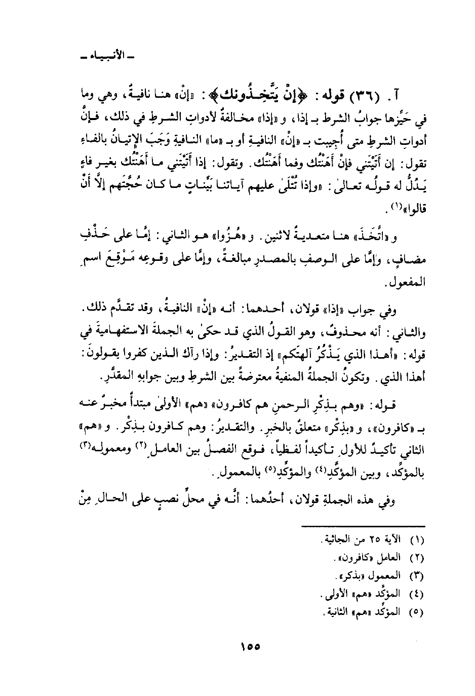 قوله: {إِن يَتَّخِذُونَكَ} : «إنْ» هنا نافيةٌ، وهي وما في حَيِّزها جوابُ الشرط ب إذا، و «إذا» مخالفةٌ لأدواتِ الشرطِ في ذلك، فإنَّ أدواتِ الشرطِ متى أُجِيبت ب «إنْ» النافيةِ أو ب «ما» النافيةِ وَجَبَ الإِتيانُ بالفاءِ تقول: إن أَتَيْتَني فإنْ أَهَنْتُك وفما أَهَنْتُك. وتقول: إذا أَتَيْتَني ما أَهَنْتُك بغير فاءٍ يَدُلُّ له قولُه تعالى: {وَإِذَا تتلى عَلَيْهِمْ آيَاتُنَا بَيِّنَاتٍ مَّا كَانَ حُجَّتَهُمْ إِلاَّ أَن قَالُواْ} [الجاثية: 25] .