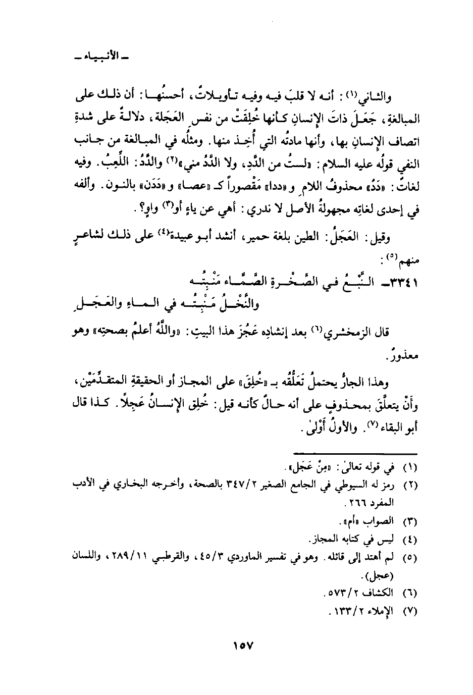والثاني: أنه لا قلبَ فيه وفيه تأويلاتٌ، أحسنُها: أن ذلك على المبالغةِ، جَعَلَ ذاتَ الإِنسانِ كأنها خُلِقَتْ من نفسِ العَجَلة، دلالةً على شدةِ اتصاف الإِنسانِ بها، وأنها مادتُه التي أُخِذ منها. ومثلُه في المبالغة من جانب النفي قولُه عليه السلام: «لستُ من الدَّدِ، ولا الدَّدُ مني» والدَّدُ: اللِّعِبُ. وفيه لغاتٌ: «دَدٌ» محذوفُ اللامِ و «ددا» مَقْصوراً ك «عصا» و «دَدَن» بالنون. وألفه في إحدى لغاتِه مجهولةُ الأصل لا ندري: أهي عن ياءٍ أو واوٍ؟ .