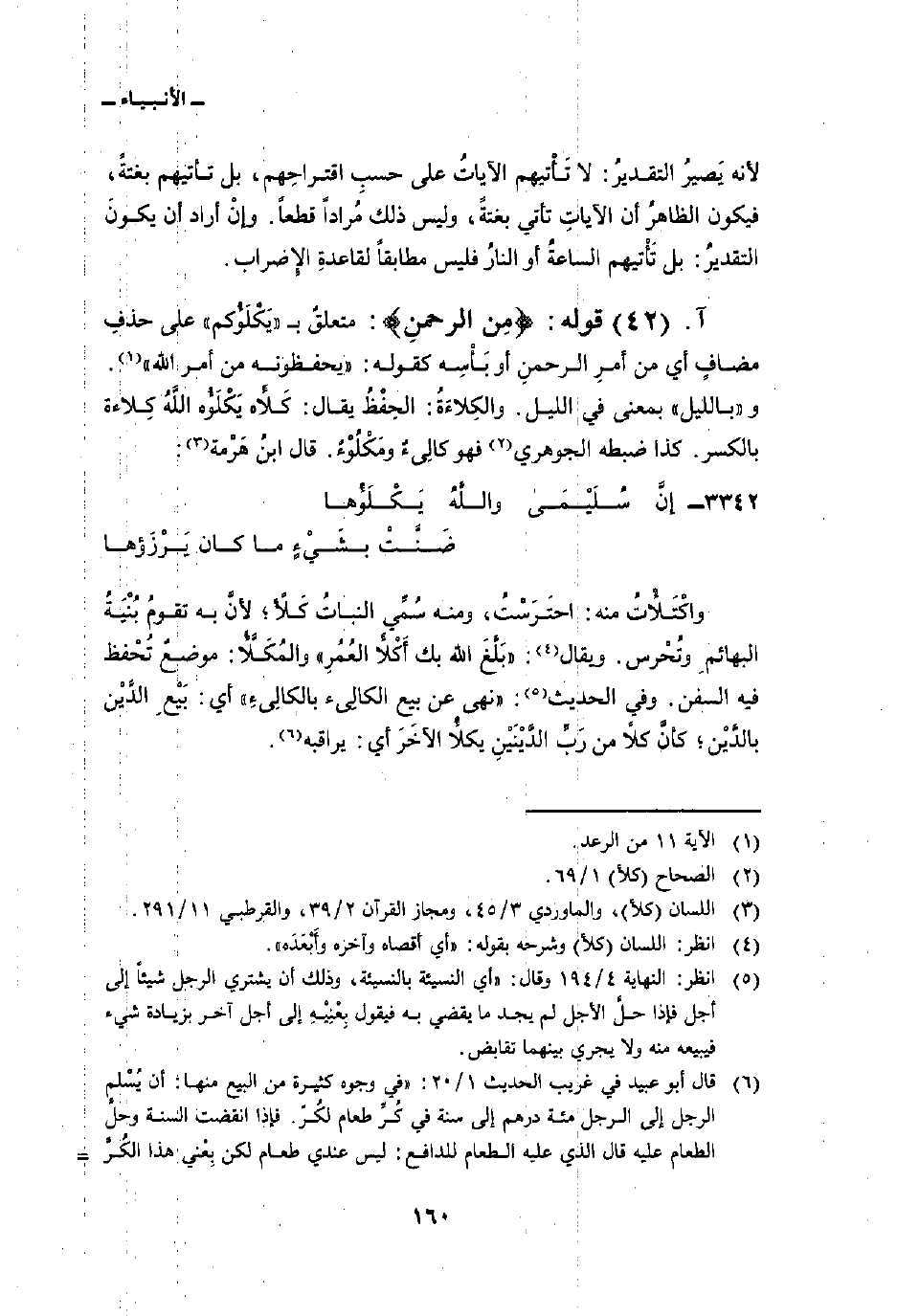 قوله: {مِنَ الرحمن} : متعلقٌ ب «يَكْلؤُكم» على حذفِ مضافٍ أي من أمرِ الرحمنِ أو بَأْسِه كقوله: {يَحْفَظُونَهُ مِنْ أَمْرِ الله} [الرعد: 11] . و «بالليل» بمعنى في الليل. والكِلاءَةُ: الحِفْظُ يقال: كَلأَه يَكْلَؤُه اللهُ كِلاءة بالكسر. كذا ضبطه الجوهري فهو كالِىءٌ ومَكْلُوْءٌ. قال ابنُ هَرْمة: