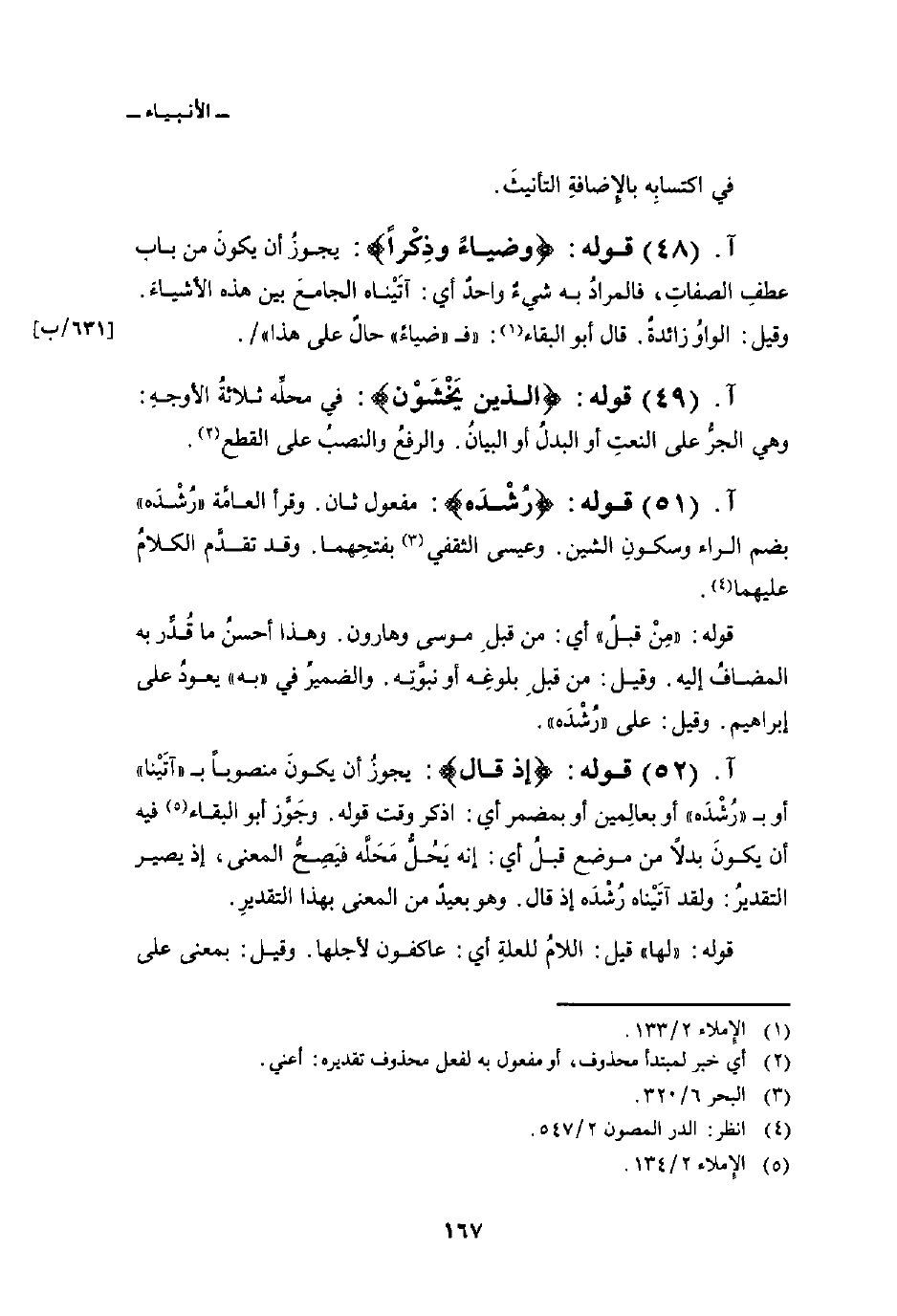 قوله: {وَضِيَآءً وَذِكْراً} : يجوزُ أن يكونَ من باب عطفِ الصفاتِ، فالمرادُ به شيءٌ واحدٌ أي: آتَيْناه الجامعَ بين هذه الأشياءَ. وقيل: الواوُ زائدةٌ. قال أبو البقاء: «ف» ضياءً «حالٌ على هذا» /.