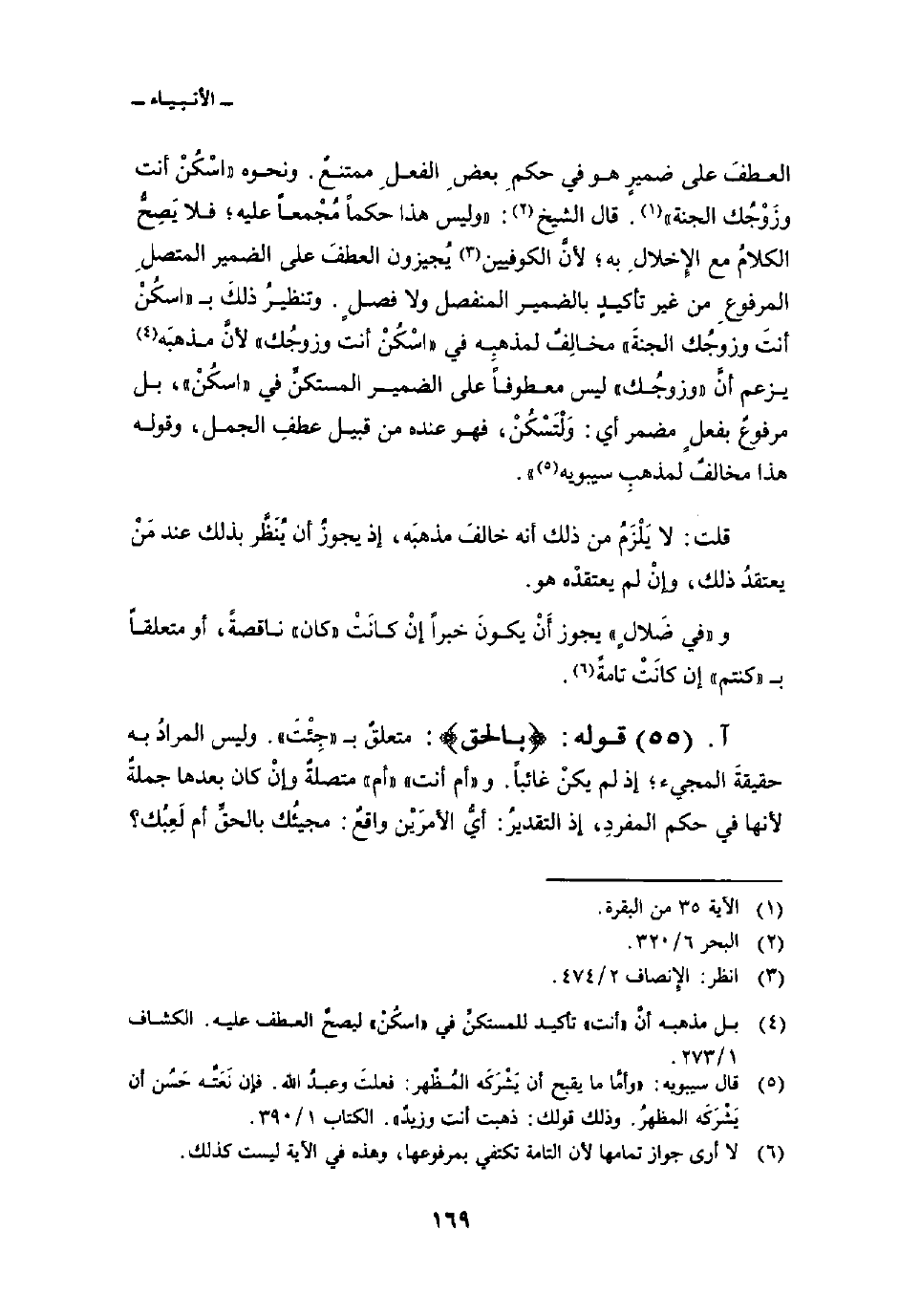 العطفَ على ضميرٍ هو في حكمِ بعضِ الفعلِ ممتنعٌ. ونحوه {اسكن أَنْتَ وَزَوْجُكَ الجنة} [البقرة: 35] . قال الشيخ:» وليس هذا حكماً مُجْمعاً عليه؛ فلا يَصِحُّ الكلامُ مع الإِخلالِ به؛ لأنَّ الكوفيين يُجيزون العطفَ على الضمير المتصلِ المرفوعِ من غير تأكيدٍ بالضمير المنفصل ولا فصلٍ. وتنظيرُ ذلك ب {اسكن أَنْتَ وَزَوْجُكَ الجنة} مخالِفٌ لمذهبِه في {اسكن أَنْتَ وَزَوْجُكَ} لأنَّ مذهبَه يزعم أنَّ «وزوجُك» ليس معطوفاً على الضمير المستكنِّ في «اسكُنْ» ، بل مرفوعٌ بفعلٍ مضمر أي: وَلْتَسْكُنْ، فهو عنده من قبيل عطفِ الجمل، وقوله هذا مخالفٌ لمذهبِ سيبويه «.