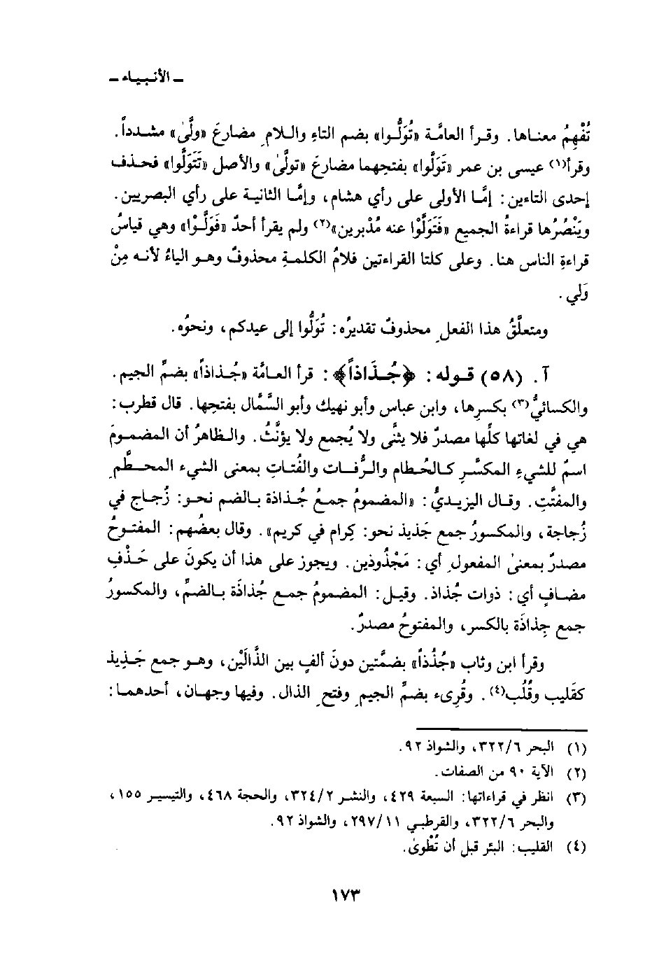 وقرأ ابن وثاب «جُذُذاً» بضمَّتين دونَ إلفٍ بين الذَّالَيْن، وهو جمع جَذِيذ كقَليب وقُلُب. وقُرِىء بضمِّ الجيمِ وفتحِ الذال. وفيها وجهان، أحدهما:
