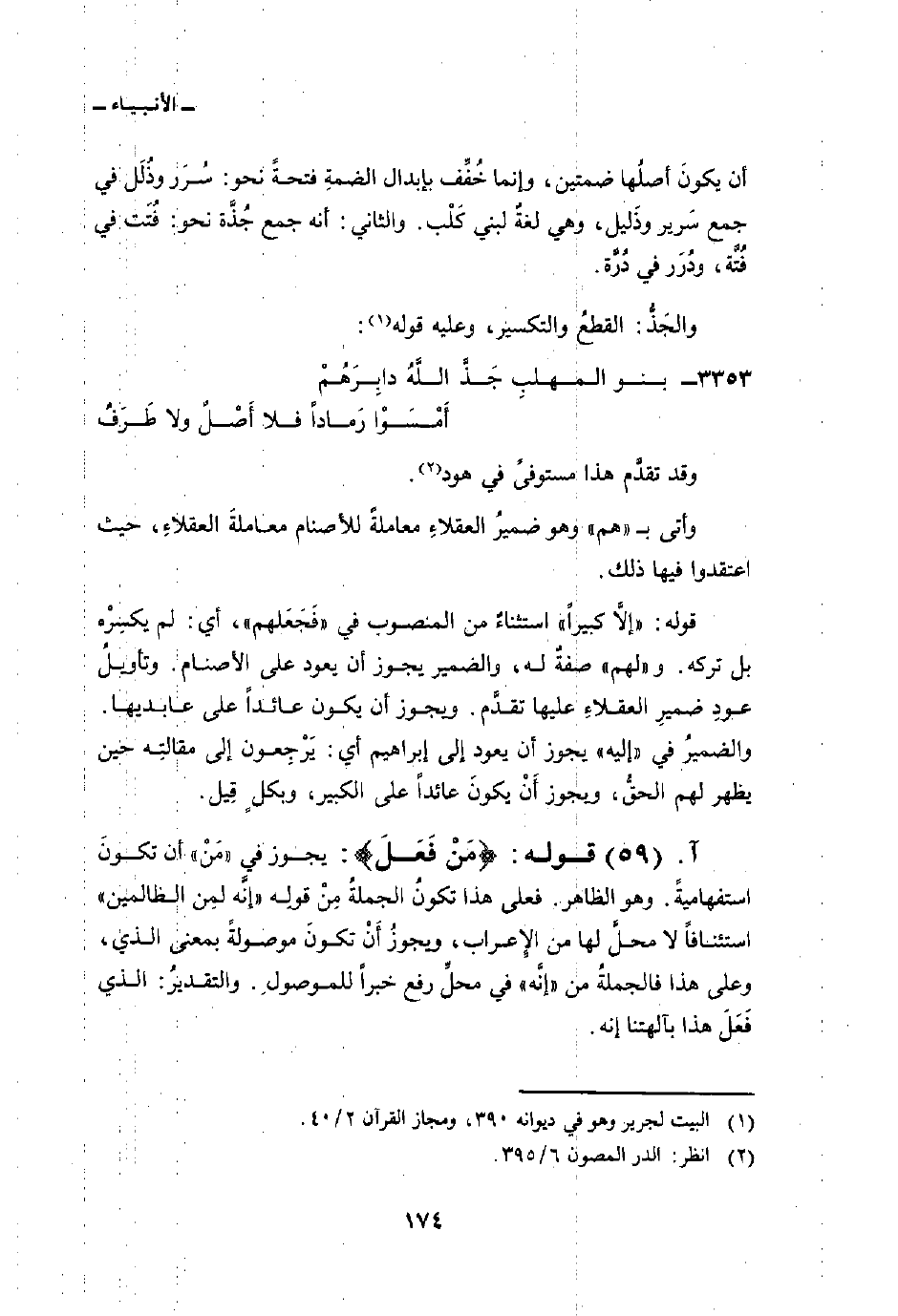 قوله: {إِلاَّ كَبِيراً} استثناءٌ من المنصوب في «فَجَعَلهم» ، أي: لم يكسِرْه بل تركه. و «لهم» صفةٌ له، والضمير يجوز أن يعود على الأصنام. وتأويلُ عودِ ضميرِ العقلاءِ عليها تقدَّم. ويجوز أن يكون عائداً على عابديها. والضميرُ في «إليه» يجوز أن يعود إلى إبراهيم أي: يَرْجِعون إلى مقالتِه حين يظهر لهم الحقُّ، ويجوز أَنْ يكونَ عائداً على الكبير، وبكلٍ قِيل.
