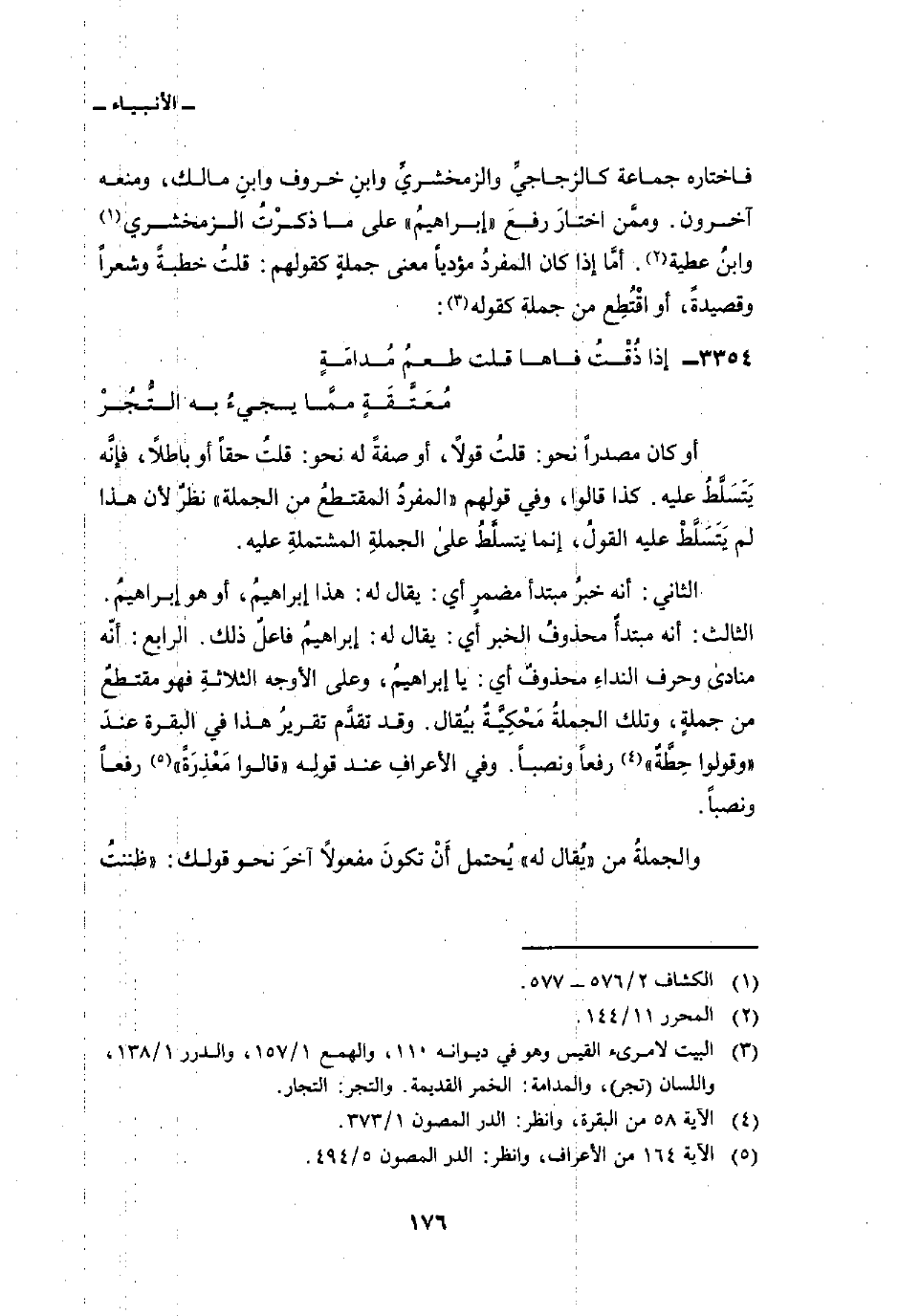 فاختاره جماعة كالزجاجيِّ والزمخشريِّ وابنِ خروف وابنِ مالك، ومنعه آخرون. وممَّن اختارَ رفعَ «إبراهيمُ» على ما ذكرْتُ الزمخشري وابنُ عطية. أمَّا إذا كان المفردُ مؤدياً معنى جملةٍ كقولهم: قلتُ خطبةً وشعراً وقصيدةً، أو اقْتُطِع من جملة كقوله: