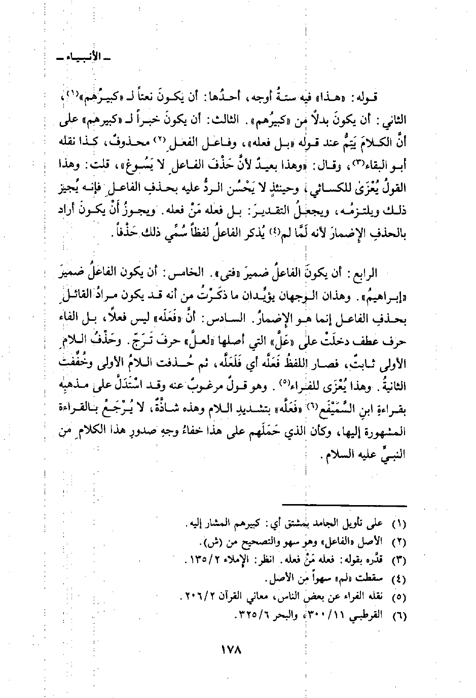 الرابع: أن يكونَ الفاعلُ ضميرَ «فتى» . الخامس: أن يكون الفاعلُ ضميرَ «إبراهيمُ» . وهذان الوجهان يؤيِّدان ما ذكَرْتُ من أنه قد يكون مرادُ القائلِ بحذفِ الفاعل إنما هو الإِضمارُ. السادس: أنَّ «فَعَلَه» ليس فعلاً، بل الفاء حرف عطف دخلَتْ على «عَلَّ» التي أصلها «لعلَّ» حرفَ تَرَجّ. وحَذْفُ اللامِ الأولى ثابتٌ، فصار اللفظُ فَعَلَّه أي فَلَعَلَّه، ثم حُذفت اللامُ الأولى وخُفِّفت الثانيةُ. وهذا يُعْزَى للفراء. وهو قولٌ مرغوبٌ عنه وقد اسْتَدَلَّ على مذهبِه بقراءةِ ابنِ السَّمَيْفَع «فَعَلَّه» بتشديدِ اللام وهذه شاذَّةٌ، لا يُرْجَعُ بالقراءة المشهورة إليها، وكأن الذي حَمَلَهم على هذا خفاءُ وجهِ صدورِ هذا الكلامِ من النبيِّ عليه السلام.