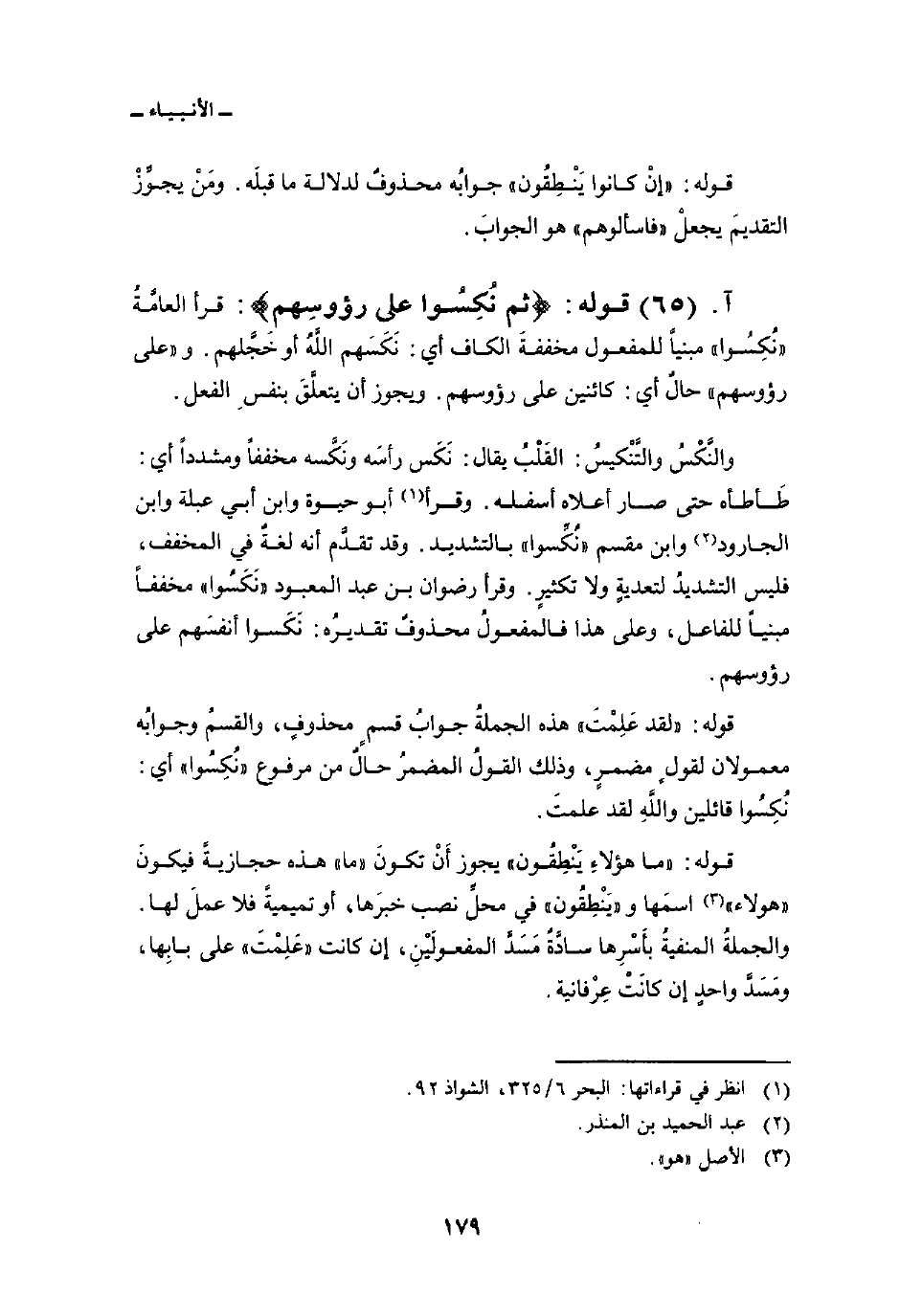 قوله: {ثُمَّ نُكِسُواْ على رُءُوسِهِمْ} : قرأ العامَّةُ «نُكِسُوا» مبنياً للمفعول مخففةَ الكاف أي: نَكَسَهم اللهُ أو خَجَّلهم. و {على رُءُوسِهِمْ} حالٌ أي: كائنين على رؤوسهم. ويجوز أن يتعلَّق بنفسِ الفعل.