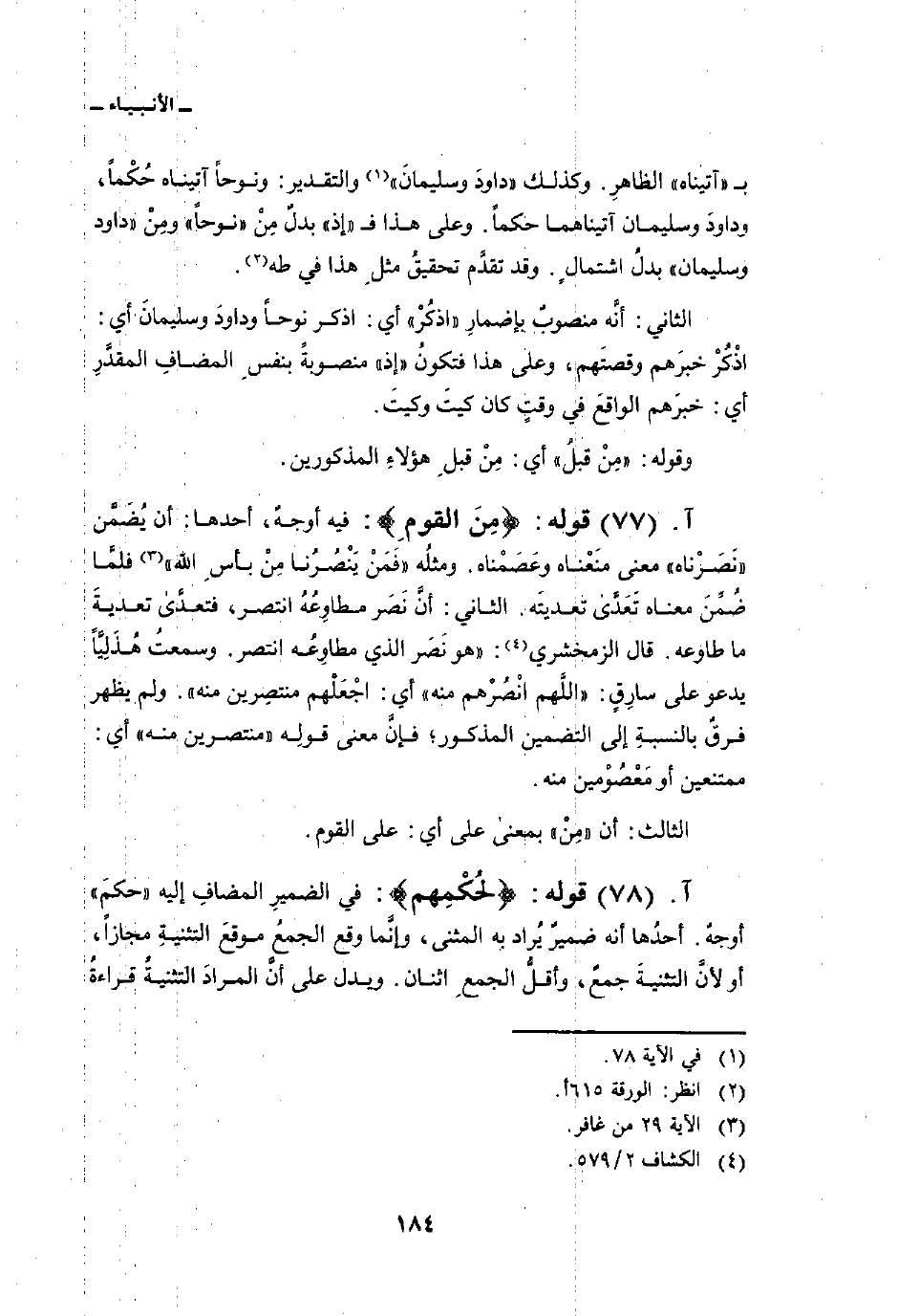 الثاني: أنَّه منصوبٌ بإضمارِ «اذكُرْ» أي: اذكر نوحاً وداودَ وسليمانَ أي: اذْكُرْ خبَرهم وقصتَهم، وعلى هذا فتكونُ «إذ» منصوبةً بنفسِ المضافِ المقَّدرِ أي: خبرَهم الواقعَ في وقتٍ كان كيتَ وكيتَ.