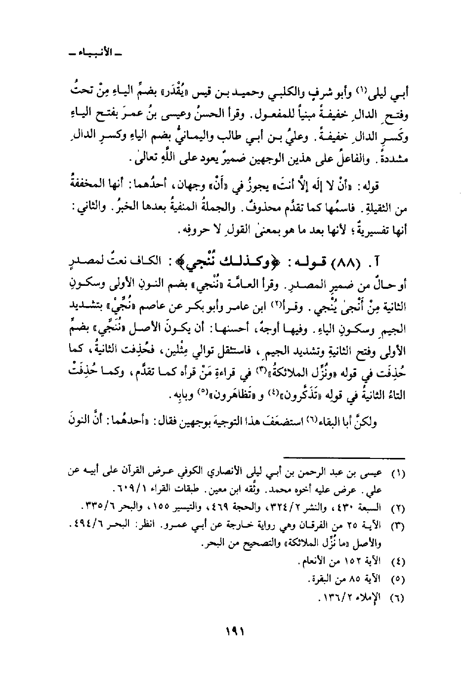 قوله: {وكذلك نُنجِي} : الكاف نعتٌ لمصدرٍ أو حالٌ من ضميرِ المصدرِ. وقرأ العامَّة «نُنْجي» بضم النونِ الأولى وسكونِ الثانية مِنْ أَنْجى يُنْجي. وقرأ ابن عامر وأبو بكر عن عاصم «نُجِّيْ» بتشديد الجيمِ وسكونِ الياءِ. وفيها أوجهٌ، أحسنها: أن يكونَ الأصل «نُنَجِّي» بضمِّ الأولى وفتح الثانيةِ وتشديد الجيمِ، فاستثقل توالي مِثْلين، فحُذِفت الثانيةٌ، كما حُذِفَت في قوله {وَنُزِّلَ الملائكة} [الفرقان: 25] في قراءةِ مَنْ قرأه كما تقدَّم، وكما حُذِفَتْ التاءُ الثانيةُ في قولِه {تَذَكَّرُونَ} [الأنعام: 152] و {تَظَاهَرُونَ} [البقرة: 85] وبابِه.