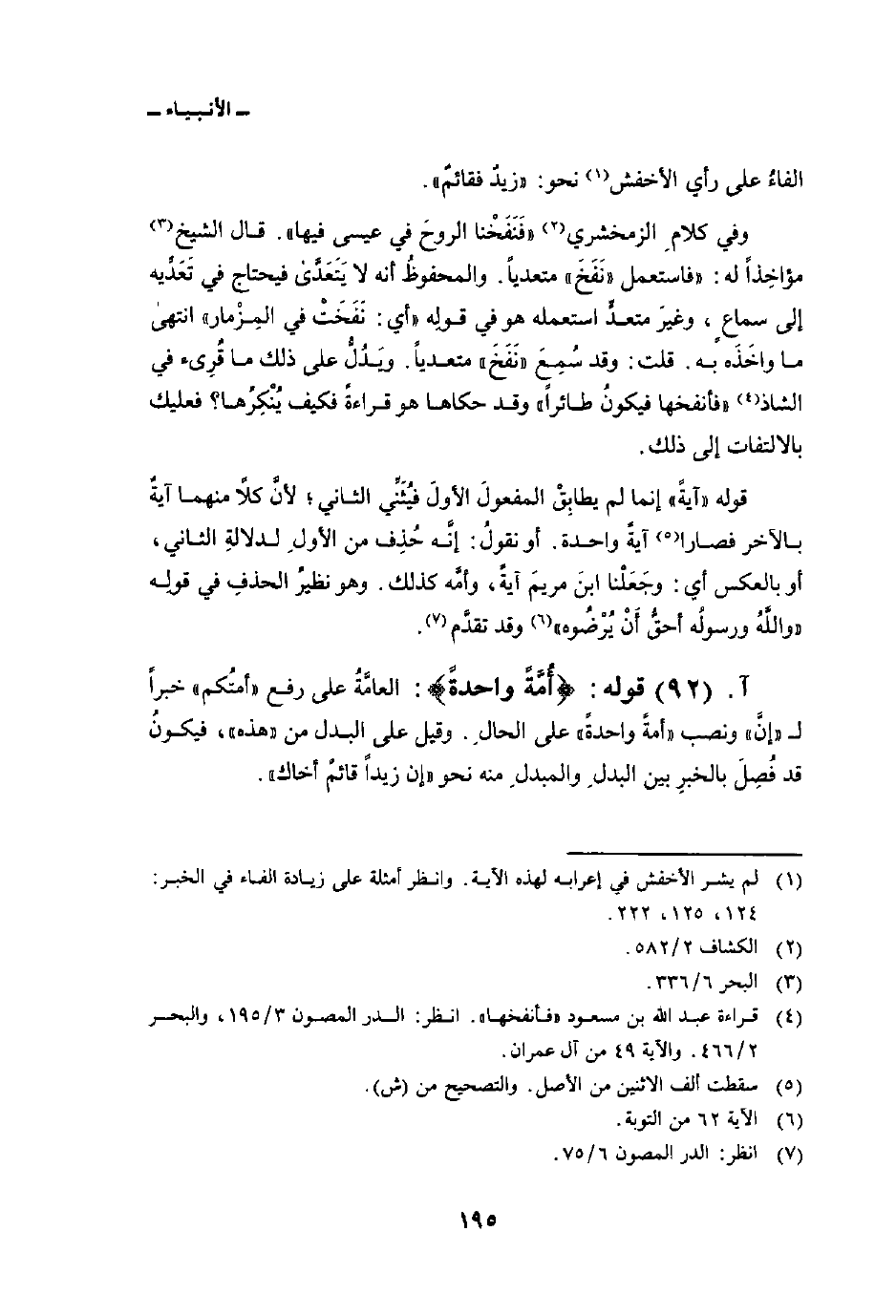وفي كلامِ الزمخشري «فَنَفَخْنا الروحَ في عيسى فيها» . قال الشيخ مؤاخِذاً له: «فاستعمل» نَفَخَ «متعدياً» . والمحفوظُ أنه لا يتعدى فيحتاج في تَعَدِّيه إلى سماعٍ، وغيرَ متعدٍّ استعمله هو في قولِه «أي: نَفَخَتْ في المِزْمار» انتهى ما واخَذَه به. قلت: وقد سُمِعَ «نَفَخَ» متعدياً. ويَدُلُّ على ذلك ما قُرِىء في الشاذ «فأنفخها فيكونُ طائراً» وقد حكاها هو قراءةً فكيف يُنْكِرُها؟ فعليك بالالتفات إلى ذلك.