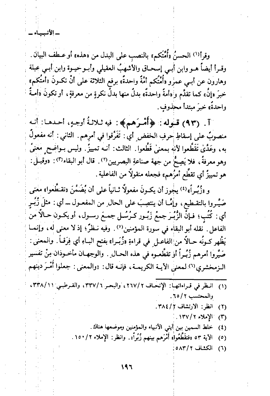 و «زُبُراً» يجوز أن يكونَ مفعولاً ثانياً على أن يُضَمَّنَ «تقطَّعوا» معنى صَيَّروا بالتقطيع، وإمَّا أن ينتصِبَ على الحالِ من المفعول أي: مثلَ زُبُرٍ أي: كُتُبٍ؛ فإنَّ الزُّبُرَ جمعُ زَبُور كرُسُل جمعَ رسول، أو يكون حالاً من الفاعل. نقله أبو البقاء في سورة المؤمنين. وفيه نظرٌ؛ إذ لا معنى له، وإنما يَظْهر كونُه حالاً من الفاعلِ في قراءةِ «زُبَرا» بفتح الباءِ أي فِرَقاً. والمعنى: صَيَّروا أمرهم زُبُراً أو تقطَّعوه في هذه الحالِ. والوجهان مأخوذان مِنْ تفسير الزمخشري لمعنى الآية الكريمة، فإنه قال: «والمعنى: جعلوا أَمْرَ دينهم