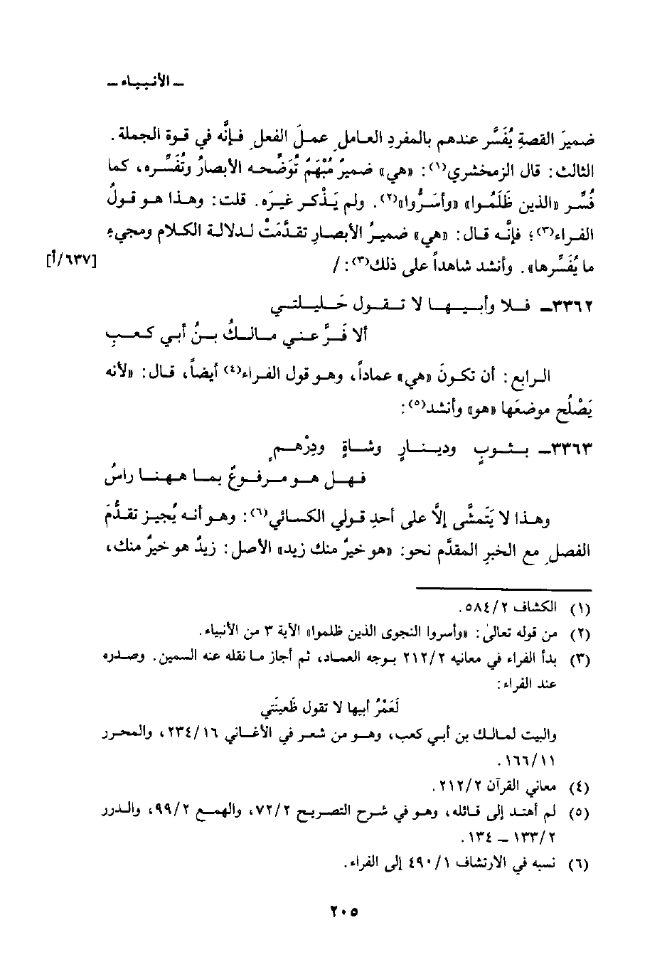 ضميرَ القصةِ يُفَسَّر عندهم بالمفردِ العاملِ عملَ الفعلِ فإنَّه في قوة الجملة. الثالث: قال الزمخشري: «هي» ضميرٌ مُبْهَمٌ تُوَضِّحه الأبصارُ وتُفَسِّره، كما فُسِّر {الذين ظَلَمُواْ} {وَأَسَرُّواْ} [الأنبياء: 3] . ولم يَذْكر غيرَه. قلت: وهذا هو قولُ الفراء؛ فإنَّه قال: «هي» ضميرُ الأبصارِ تقدَّمَتْ لدلالة الكلام ومجيءِ ما يُفَسِّرها «. وأنشد شاهداً على ذلك: /