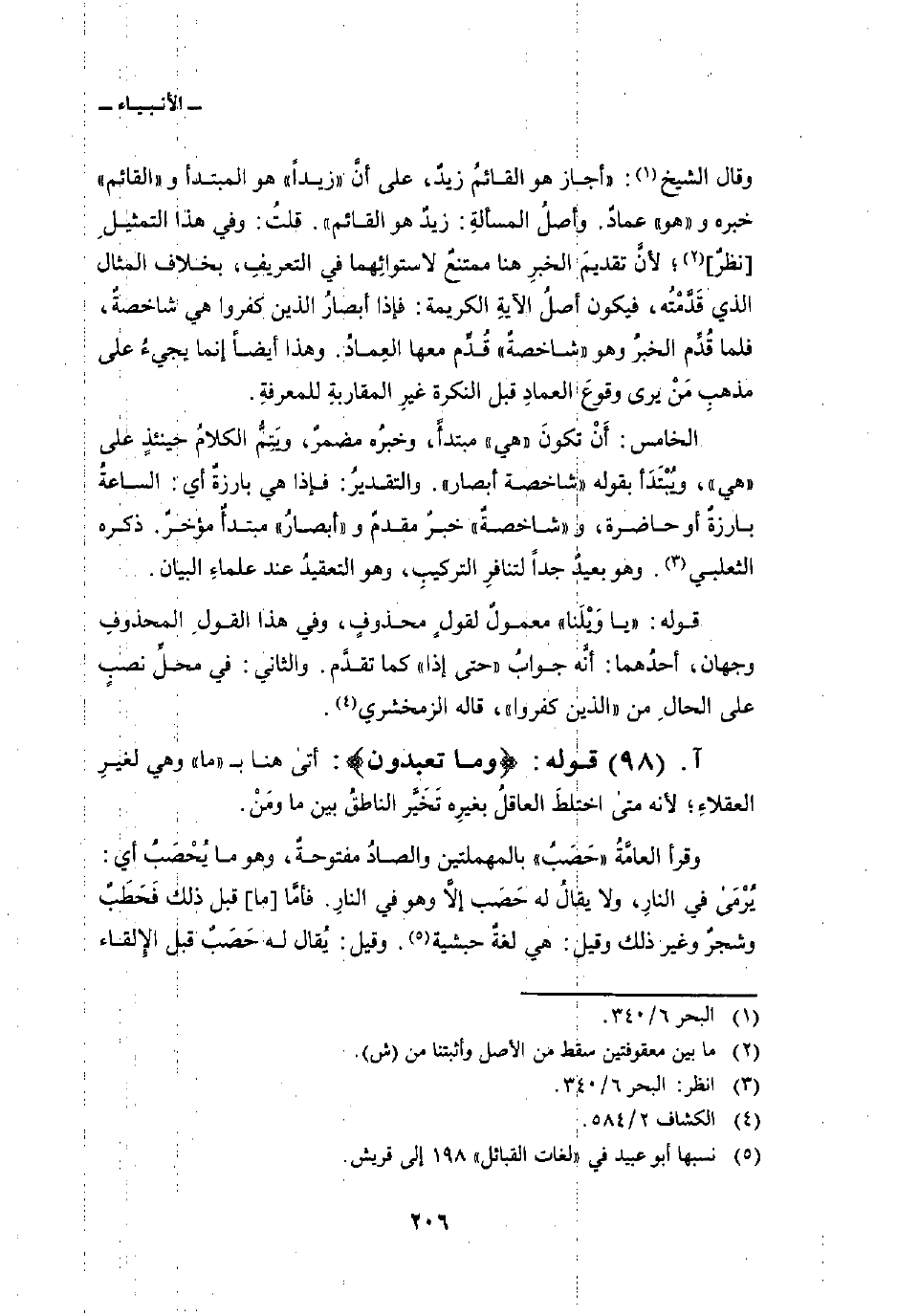 وقال الشيخ: «أجاز هو القائمُ زيدٌ، على أنَّ» زيداً «هو المبتدأ و» القائم «خبره و» هو «عمادٌ. وأصلُ المسألةِ: زيدٌ هو القائم» . قلتُ: وفي هذا التمثيلِ [نظرٌ] ؛ لأنَّ تقديمَ الخبرِ هنا ممتنعٌ لا ستوائِهما في التعريفِ، بخلاف المثال الذي قَدَّمْتُه، فيكون أصلُ الآيةِ الكريمة: فإذا أبصارُ الذين كفروا هي شاخصةٌ، فلما قُدِّم الخبرُ وهو «شاخصةٌ» قُدِّم معها العِمادُ. وهذا أيضاً إنما يجيءُ على مذهبِ مَنْ يرى وقوعَ العمادِ قبل النكرة غيرِ المقاربةِ للمعرفةِ.