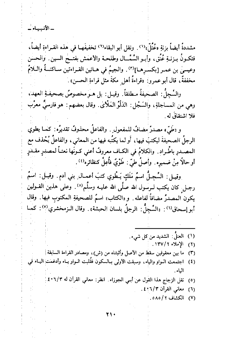 وقيل: السِّجِلُّ سامُ مَلَكٍ يَطْوي كتبَ أعمالِ بني آدم. وقيل: اسمُ رجلٍ كان يكتب لرسول الله صلَّى الله عليه وسلَّم. وعلى هذين القولين يكون المصدرُ مضافاً لفاعله. و «الكتاب» اسمٌ للصحيفةِ المكتوبِ فيها. وقال أبو إسحاق: «السِّجِلُّ: الرجلُ بلسان الحبشة» . وقال الزمخشري: كما