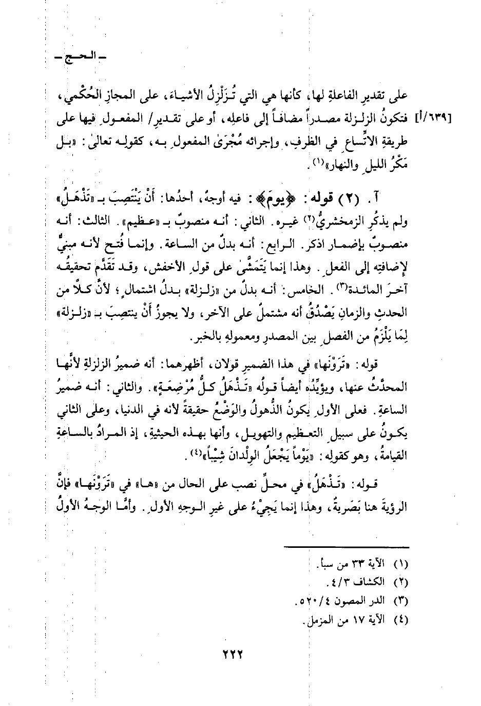 قوله: {يَوْمَ} : فيه أوجهٌ، أحدُها: أَنْ يَنْتَصِبَ ب «تَذْهَلُ» ولم يذكُرِ الزمخشريُّ غيره. الثاني: أنه منصوبٌ ب «عظيم» . الثالث: أنه منصوبٌ بإضمار اذكر. الرابع: أنه بدلٌ من الساعة. وإنما فُتح لأنه مبنيٌّ لإِضافتِه إلى الفعلِ. وهذا إنما يتمشى على قولِ الأخفش، وقد تَقَدَّم تحقيقُه آخرَ المائدة. الخامس: أنه بدلٌ من «زلزلة» بدلُ اشتمالٍ؛ لأنَّ كلاً من الحدثِ والزمانِ يَصْدُقُ أنه مشتملٌ على الآخر، ولا يجوزُ أَنْ ينتصِبَ ب «زلزلة» لِمَا يَلْزَمُ من الفصلِ بين المصدرِ ومعمولِه بالخبر.