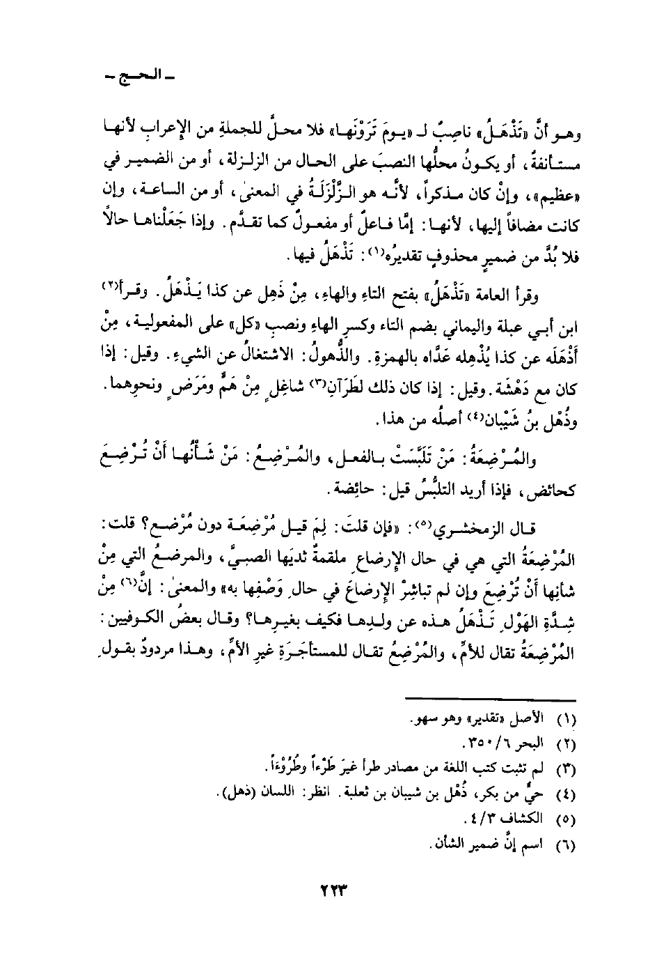 وهو أنَّ «تَذْهَلُ» ناصِبٌ ل «يومَ تَرَوْنَها» فلا محلَّ للجملةِ من الإِعرابِ لأنها مستأنفةٌ، أو يكونُ محلُّها النصبَ على الحال من الزلزلة، أو من الضمير في «عظيم» ، وإنْ كان مذكراً، لأنَّه هو الزَّلْزَلَةُ في المعنى، أو من الساعة، وإن كانت مضافاً إليها، لأنها: إمَّا فاعلٌ أو مفعولٌ كما تقدَّم. وإذا جَعَلْناها حالاً فلا بُدَّ من ضميرٍ محذوفٍ تقديرُه: تَذْهَلُ فيها.