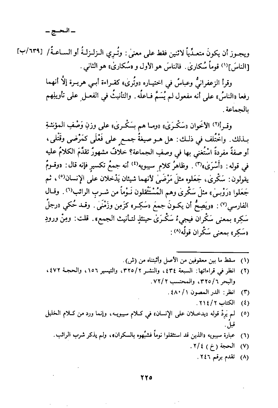 وقرأ الأخَوان «سكرى» «وما هم بسكرى» على وزنِ وَصْفِ المؤنثةِ بذلك. واخْتُلف في ذلك: هل هو صيغةٌ جمعٍ على فَعْلَى كمَرْضى وقَتْلى، أو صفةٌ مفردةٌ اسْتُغني بها في وصفِ الجماعة؟ خلافٌ مشهورٌ تقدَّمَ الكلامُ عليه في قوله: «أسرى» . وظاهرُ كلامِ سيبويه أنه جمعُ تكسيرٍ فإنه قال: «وقومٌ يقولون: سكرى، جَعَلوه مثلَ مرضى لأنهما شيئان يَدْخلان على الإِنسان، ثم جَعَلوا» روبى «مثلَ سكرى وهم المُسْتَثْقلون نَوْماً من شربِ الرائب. وقال الفارسي:» ويَصِحُّ أن يكونَ جمعَ «سَكِر» كزَمِن وزمنى. وقد حُكي «رجلٌ سَكِر» بمعنى سَكْران فيجيءُ سكرى حينئذٍ لتأنيث الجمع «. قلت: ومِنْ ورودِ» سَكِر «بمعنى سَكْران قولُه: