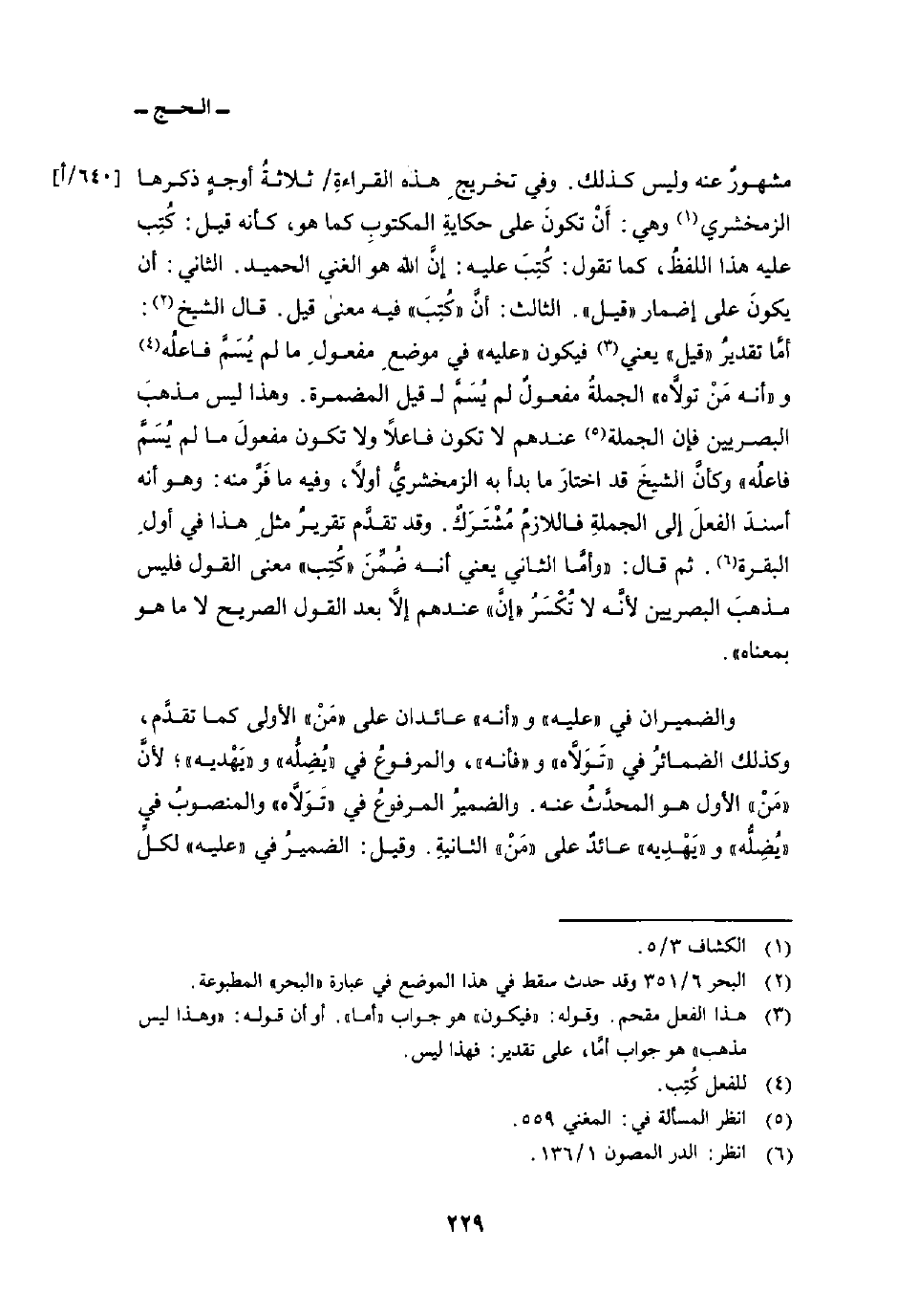 مشهورٌ عنه وليس كذلك. وفي تخريجِ هذه القراءةِ/ ثلاثةُ أوجهٍ ذكرها الزمخشري وهي: أَنْ تكونَ على حكايةِ المكتوبِ كما هو، كأنه قيل: كُتِب عليه هذا اللفظُ، كما تقول: كُتِبَ عليه: إنَّ الله هو الغني الحميد. الثاني أن يكونَ على إضمار «قيل» . الثالث: أنَّ «كُتِبَ» فيه معنى قيل. قال الشيخ: أمَّا تقديرُ «قيل» يعني فيكون «عليه» في موضعِ مفعولِ ما لم يُسَمَّ فاعلُه و «أنه مَنْ تولاَّه» الجملةُ مفعولٌ لم يُسَمَّ ل قيل المضمرة. وهذا ليس مذهبَ البصريين فإن الجملة عندهم لا تكون فاعلاً ولا تكون مفعولَ ما لم يُسَمَّ فاعلُه «وكأنَّ الشيخَ قد اختارَ ما بدأ به الزمخشريُّ أولاً، وفيه ما فَرَّ منه: وهو أنه أسندَ الفعلَ إلى الجملةِ فاللازمُ مُشْتَرَكٌ.