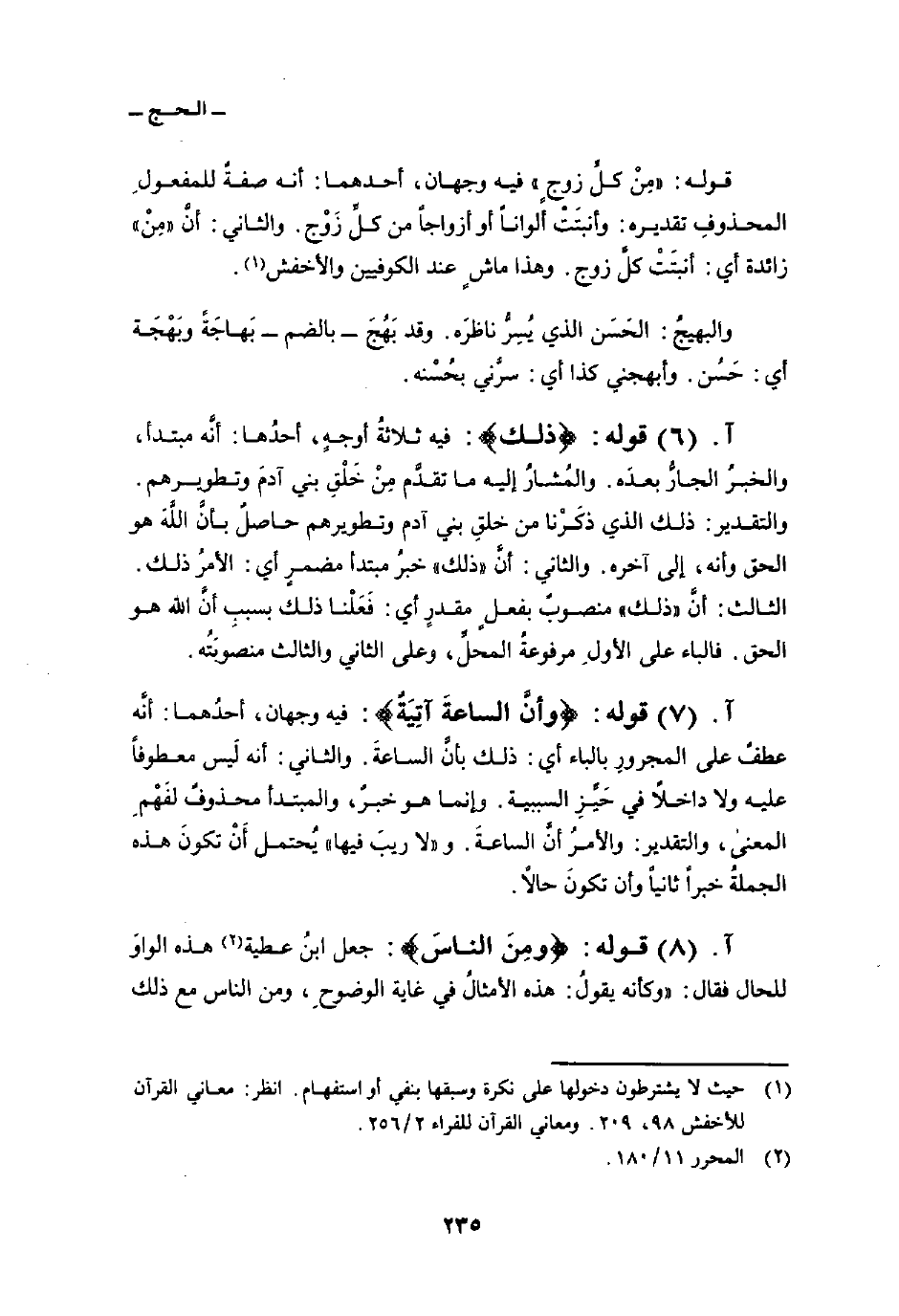 قوله: {وَأَنَّ الساعة آتِيَةٌ} : فيه وجهان، أحدُهما: أنَّه عطفٌ على المجرورِ بالباء أي: ذلك بأنَّ الساعةَ. والثاني: أنه لَيس معطوفاً عليه ولا داخلاً في حَيِّزِ السببية. وإنما هو خبرٌ. والمبتدأ محذوفٌ لفَهْمِ المعنى، والتقدير: والأمرُ أنَّ الساعةَ. و «لا ريبَ فيها» يُحتمل أَنْ تكونَ هذه الجملةُ خبراً ثانياً وأن تكونَ حالاً.