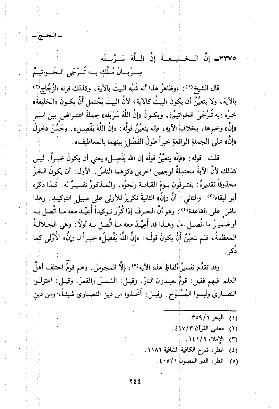 قال الشيخ:» وظاهرُ هذا أنه شَبَّه البيتَ بالآيةِ، وكذلك قرنه الزَّجَّاج بالآية، ولا يتعيَّنُ أن يكونَ البيتُ كالآية؛ لأنَّ البيتَ يَحْتمل أَنْ يكونَ «الخليفةَ» خبرُه «به ترجى الخواتيمُ» ، ويكونَ «إنَّ اللهَ سَرْبَله» جملةَ اعتراضٍ بين اسمِ «إنَّ» وخبرِها، بخلافِ الآيةِ، فإنه يتعيَّنُ قولُه: {إِنَّ الله يَفْصِلُ} . وحَسَّنَ دخولَ «إنَّ» على الجملةِ الواقعةِ خبراً طولُ الفَصْلِ بينهما بالمعاطيف «.