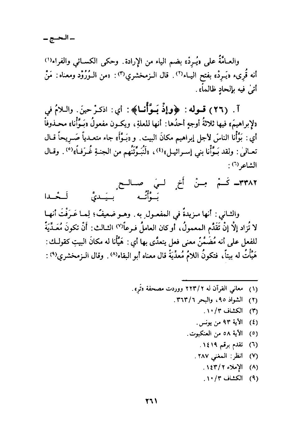 قوله: {وَإِذْ بَوَّأْنَا} : أي: اذكرْ حينَ. واللامُ في «لإِبراهيم» فيها ثلاثةُ أوجهٍ أحدُها: أنها للعلةِ، ويكون مفعولُ «بَوَّأْنا» محذوفاً أي: بَوَّأْنا الناسَ لأجل إبراهيم مكانَ البيت. و «بَوَّأَ» جاء متعدياً صَرِيحاً قال تعالى: {وَلَقَدْ بَوَّأْنَا بني إِسْرَائِيلَ} [يونس: 93] ، {لَنُبَوِّئَنَّهُمْ مِّنَ الجنة غُرَفَاً} [العنكبوت: 58] . وقال الشاعر: