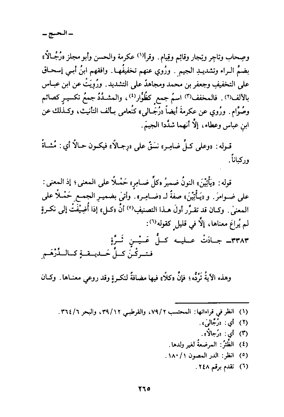 وصِحاب وتاجِر وتِجار وقائِم وقِيام. وقرأ عكرمة والحسن وأبو مجلز «رُجَّالاً» بضمِّ الراء وتشديدِ الجيمِ. ورُوي عنهم تخفيفُها. وافقهم ابنُ أبي إسحاق على التخفيفِ وجعفر من محمد ومجاهدٌ على التشديد. ورُوِيَتْ عن ابن عباس بالألف. فالمخفف اسمُ جمعٍ كظُؤَار، والمشدَّدُ جمعُ تكسيرٍ كصائم وصُوَّام. ورُوي عن عكرمةَ أيضاً «رُجَالى» كنُعامى بألف التأنيث، وكذلك عن ابنِ عباس وعطاء، إلاَّ أنهما شدَّدا الجيمَ.