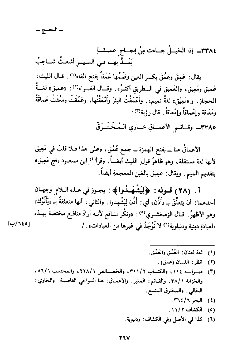 3385 - وقاتمِ الأعماقِ خاوي المُخْتَرَقْ ... الأعماقُ هنا بفتح الهمزة جمع عُمْق، وعلى هذا فلا قلبَ في مَعِيق لأنها لغة مستقلة، وهو ظاهرُ قولِ الليث أيضاً. وقرأ ابن مسعود «فج مَعِيق» بتقديم الميم. ويقال: غَمِيق بالغين المعجمةِ أيضاً.