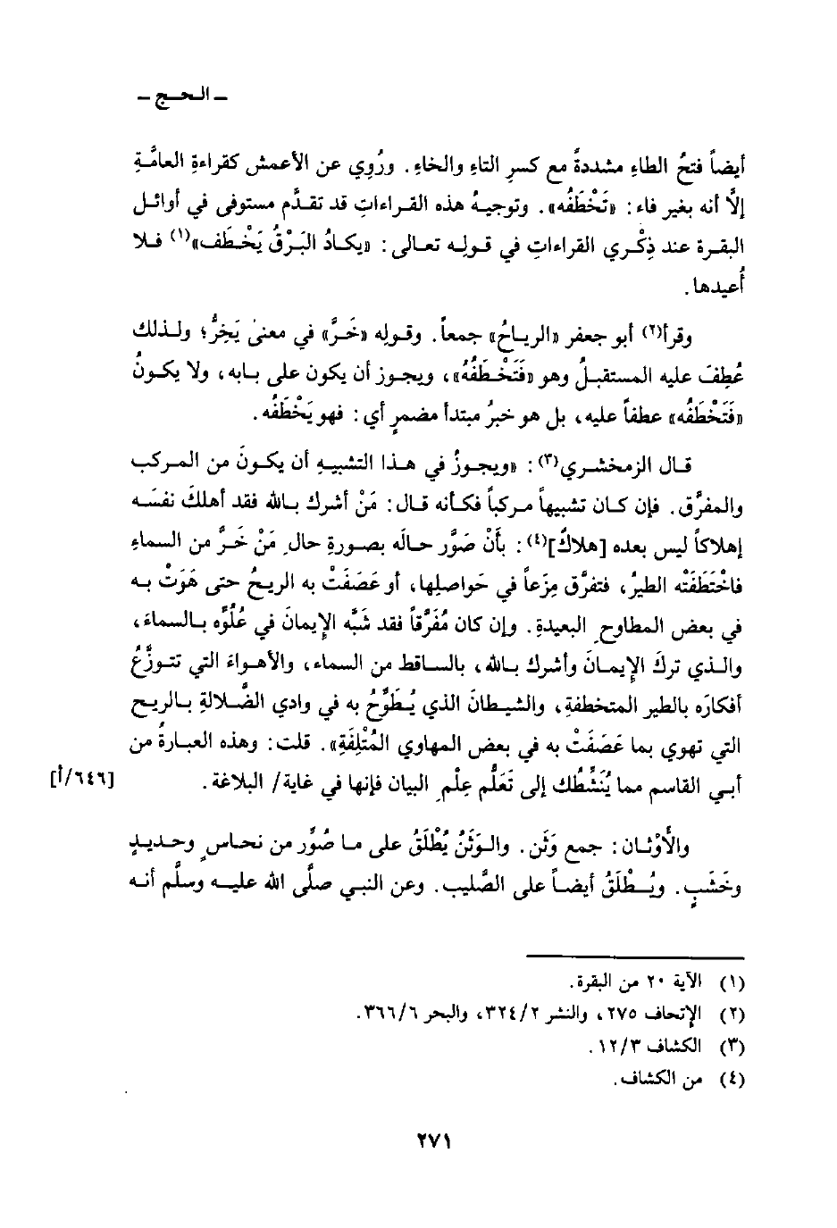 قال الزمخشري: «ويجوزُ في هذا التشبيهِ أن يكونَ من المركب والمفرَّق. فإن كان تشبيهاً مركباً فكأنه قال: مَنْ أشرك بالله فقد أهلكَ نفسَه إهلاكاً ليس بعده [هلاكٌ] : بأَنْ صَوَّر حالَه بصورةِ حالِ مَنْ خَرَّ من السماءِ فاخْتَطَفَتْه الطيرُ، فتفرَّق مِزَعاً في حَواصلِها، أو عَصَفَتْ به الريحُ حتى هَوَتْ به في بعض المطاوحِ البعيدةِ. وإن كان مُفَرَّقاً فقد شَبَّه الإِيمانَ في عُلُوِّه بالسماءَ، والذي تركَ الإِيمانَ وأشرك بالله، بالساقط من السماء، والأهواءَ التي تتوزَّعُ أفكارَه بالطير المتخطفةِ، والشيطانَ الذي يُطَوِّحُ به في وادي الضَّلالةِ بالريح التي تهوي بما عَصَفَتْ به في بعض المهاوي المُتْلِفَةِ» . قلت: وهذه العبارةُ من أبي القاسم مما يُنَشِّطُك إلى تَعَلُّم عِلْمِ البيان فإنها في غاية/ البلاغة.