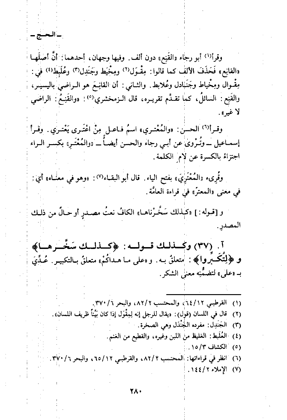 وقرأ أبو رجاء» القَنِع «دون ألف. وفيها وجهان، أحدهما: أنَّ أصلَها» القانِع «فَحَذَفَ الألف كما قالوا: مِقْوَل ومِخْيَط وجَنَدِل وعُلَبِط في: مِقْوال ومِخْياط وجَنَادل وعُلابط. والثاني: أن القانِعَ هو الراضي باليسير، والقَنِع: السائلُ، كما تقدَّم تقريره، قال الزمخشري:» والقَنِعُ: الراضي لا غير «.