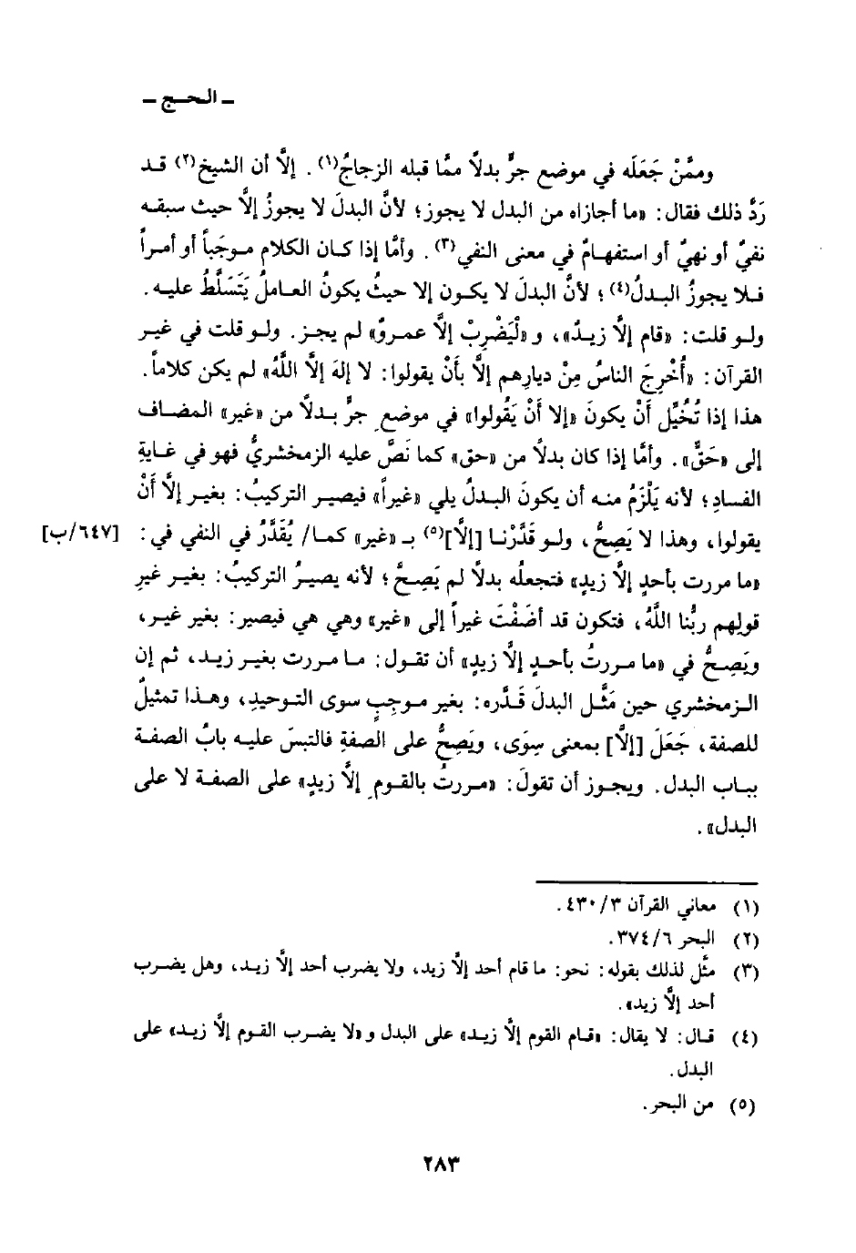 ويجوز أن تقولَ: «مررتُ بالقومِ إلاَّ زيدٍ» على الصفة لا على البدل «.