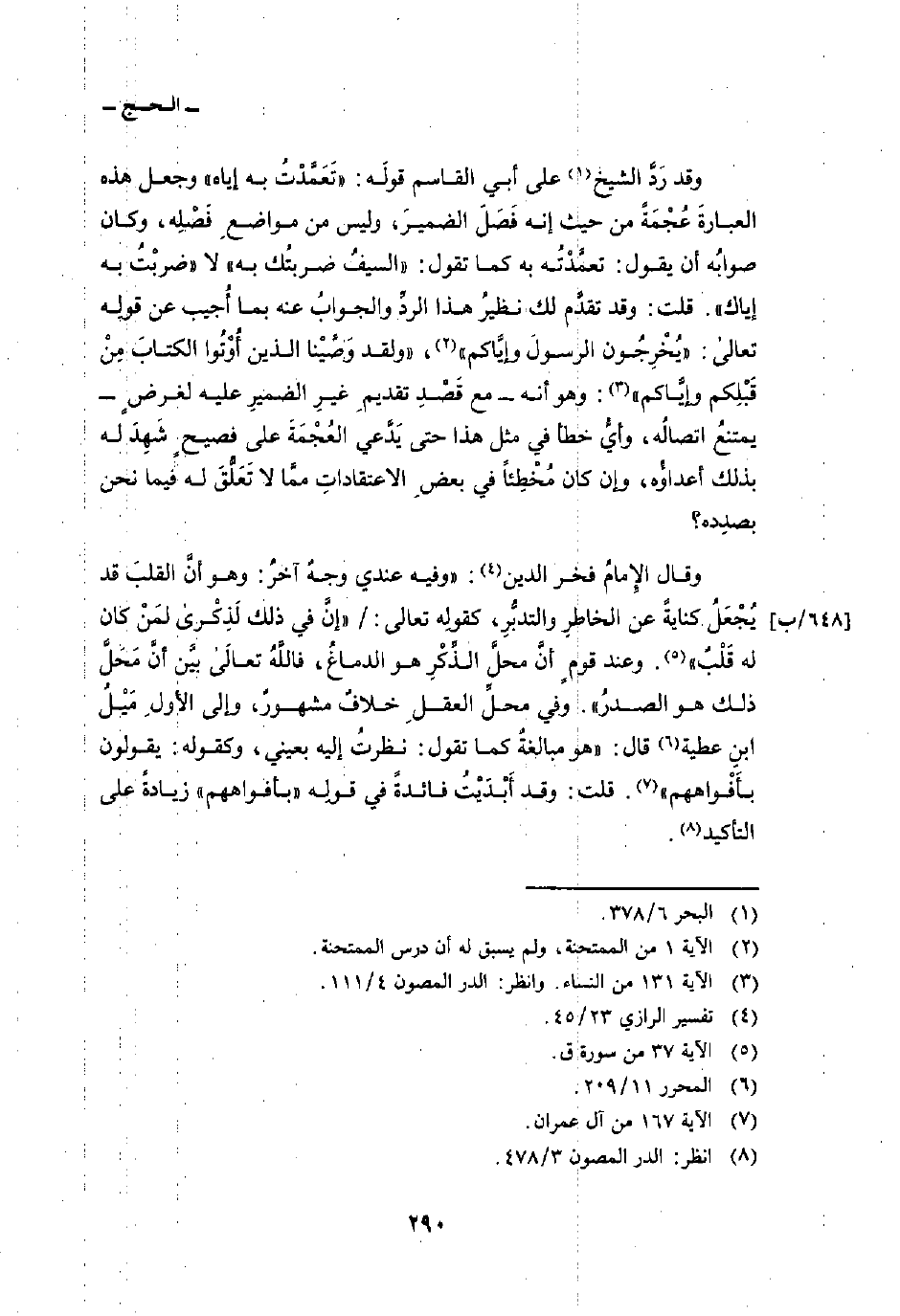 وقد رَدَّ الشيخ على أبي القاسم قولَه:» تَعَمَّدْتُ به إياه «وجعل هذه العبارةَ عُجْمَةً من حيث إنه فَصَلَ الضميرَ، وليس من مواضعِ فَصْلِه، وكان صوابُه أن يقول: تعمَّدْتُه به كما تقول:» السيفُ ضربتُك به «لا» ضربْتُ به إياك «.