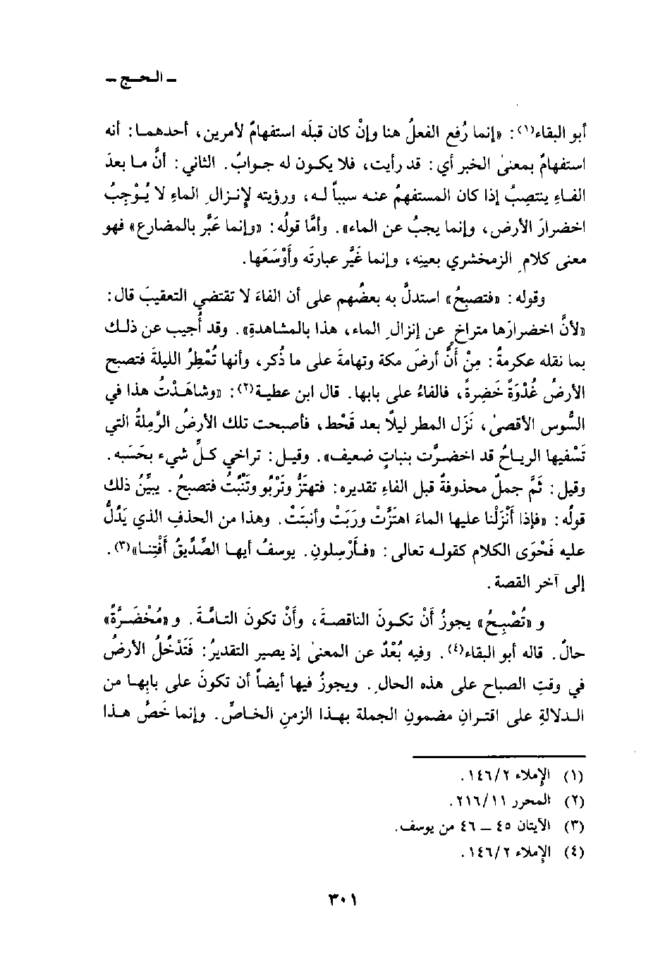 وقيل: ثَمَّ جملٌ محذوفةٌ قبل الفاءِ تقديره: فتهتَزُّ وتَرْبُو وتَنْبُتُ فتصبحُ. يبيِّنُ ذلك قولُه: {فَإِذَآ أَنزَلْنَا عَلَيْهَا المآء اهتزت وَرَبَتْ وَأَنبَتَتْ} وهذا من الحذفِ الذي يَدُلُّ عليه فَحْوَى الكلام كقوله تعالى: {فَأَرْسِلُونِ * يُوسُفُ أَيُّهَا الصديق أَفْتِنَا} [يوسف: 45-46] . إلى آخر القصة.